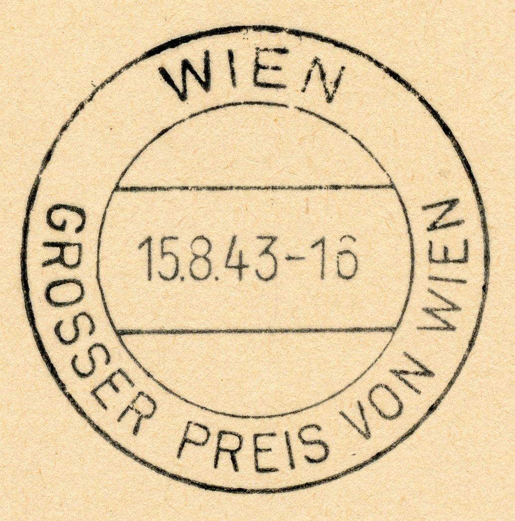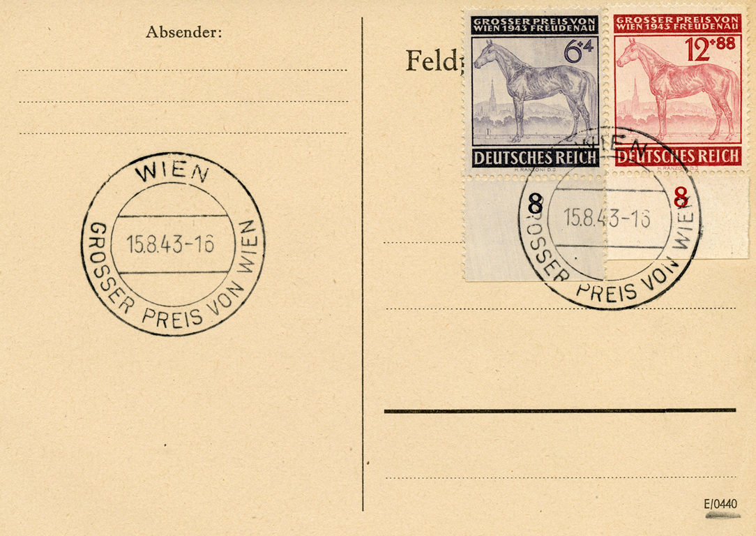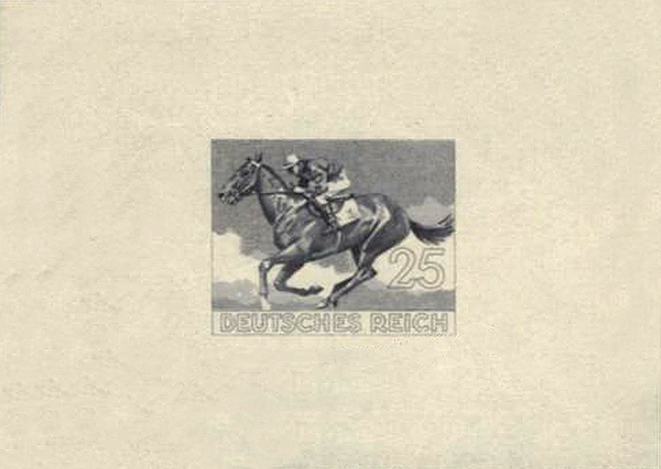 [Above: This is a prototype, presented to the postal authorities, but not approved. A very rare design and I've never seen another one. It says: 'Grosser Preis von Wien 1944 Freudenau' (Vienna Grand Prix 1944 Freudenau). Freudenau is in Austria.]