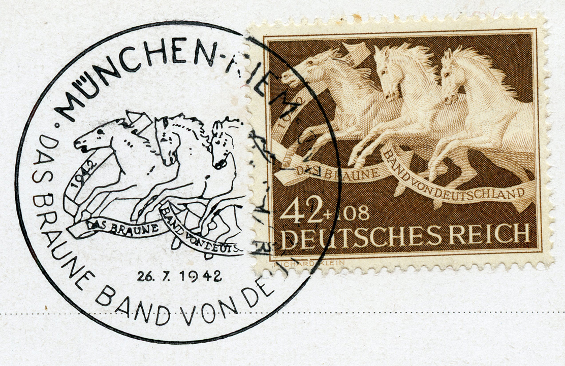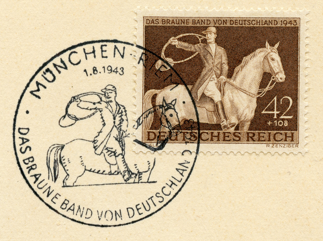 [Above: This souvenir sheet celebrates the June 1936 '3rd Race for the Brown Ribbon in Munich-Riem'. It says: 'Das braune Band von Deutschland' (The Brown Ribbon of Germany)]