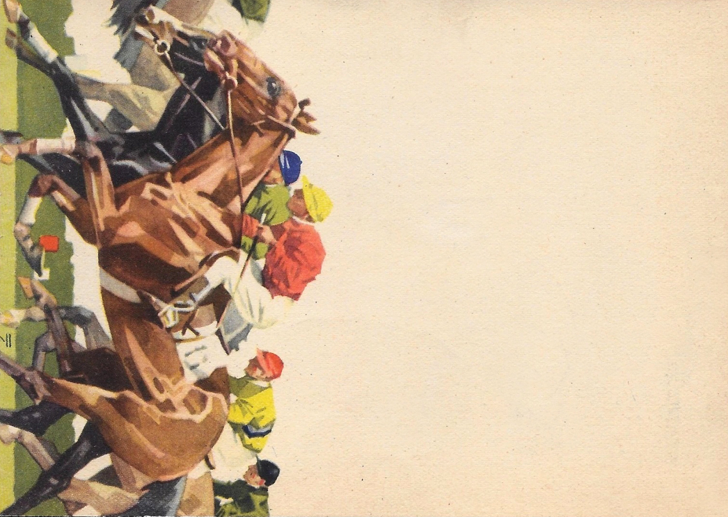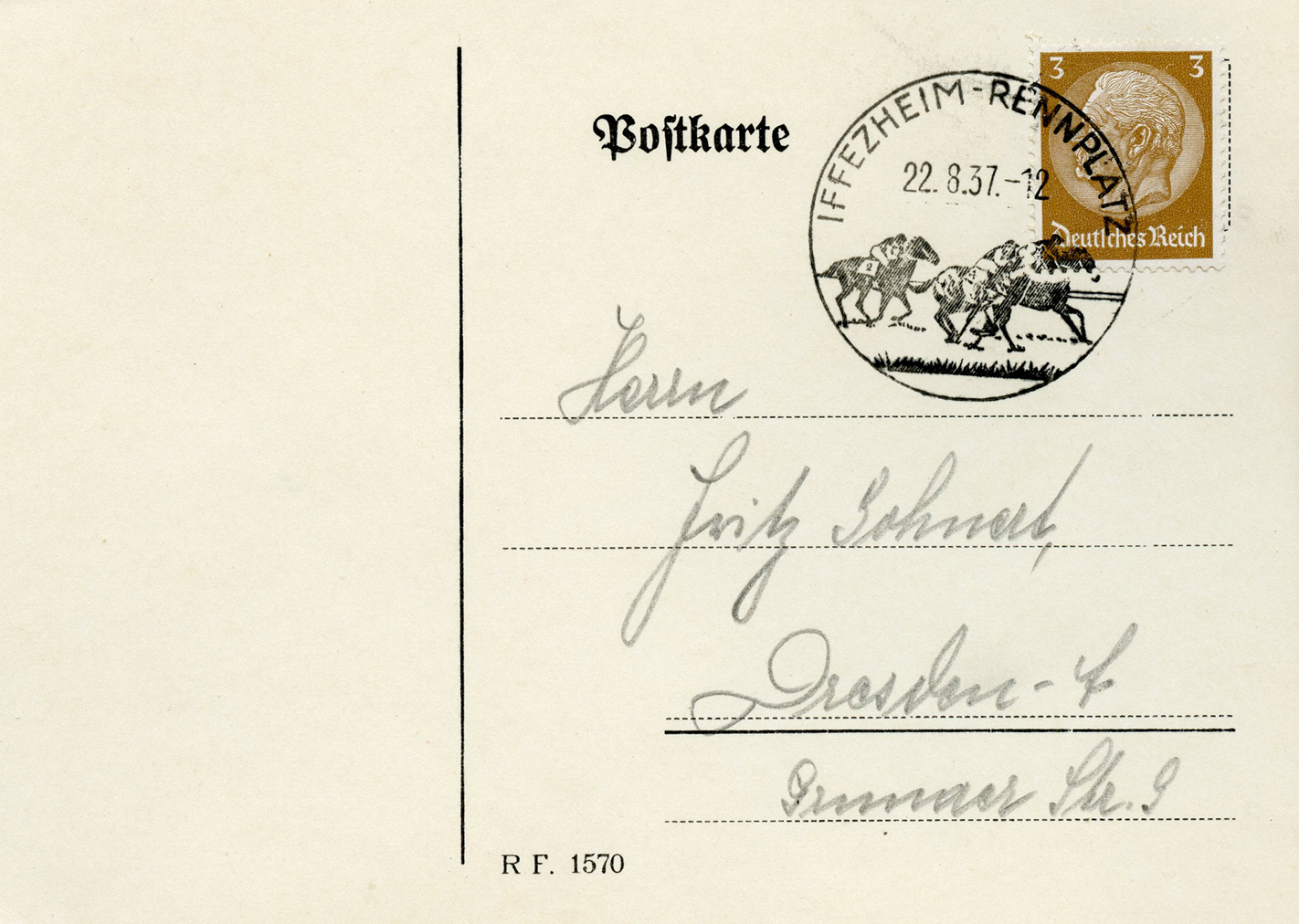 [Below: Postcard with rare horse racing cancel from August 22, 1937.]