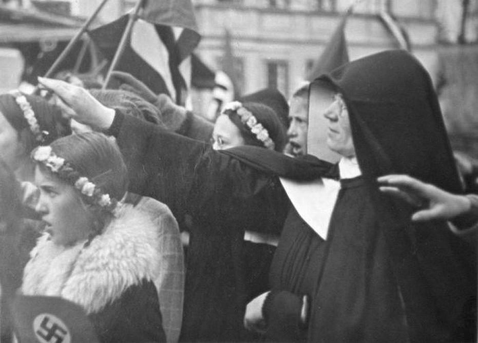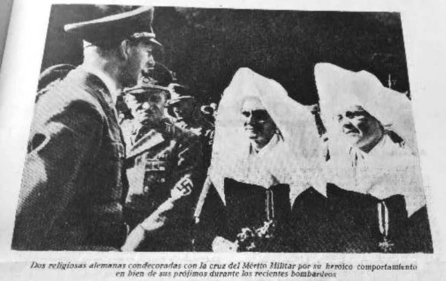 [Below: Adolf Hitler gives his autograph to a Catholic Nun.]