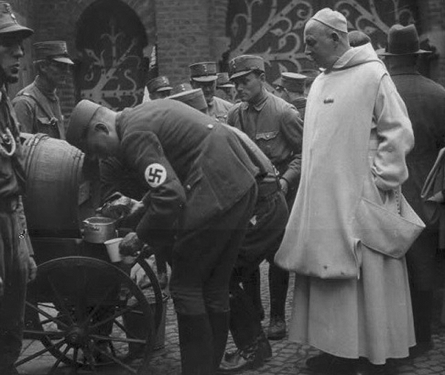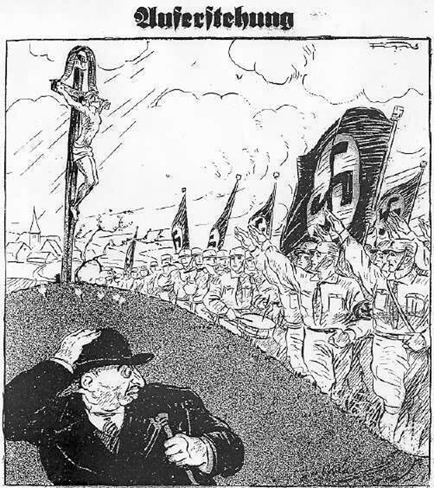 [Below: Brown Shirts and Hitler Youth surround unknown priest.]