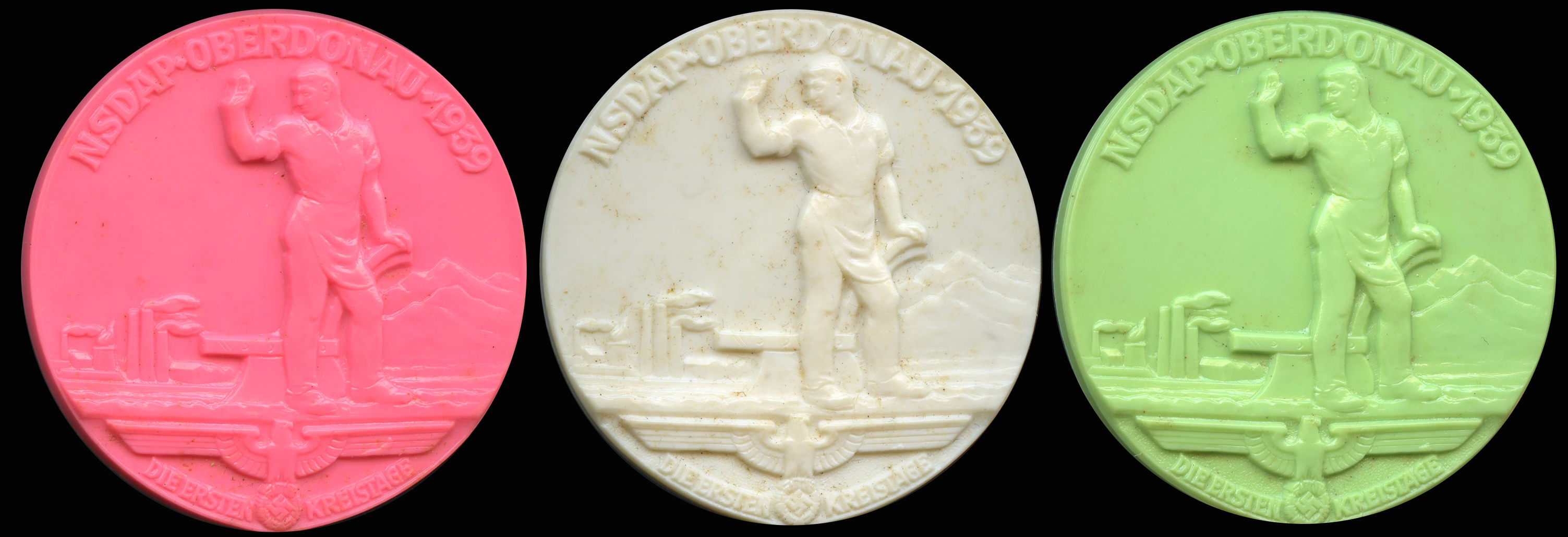 [Below: These plastic/bakelite Third Reich 'tinnies' are so strange and cool. The colors they used are very striking. They say 'NSDAP - Oberdonau- 1939 - Die Ersten Kreistage' (NSDAP - Upper Danube - 1939 - The First District Assemblies). Click to enlarge: