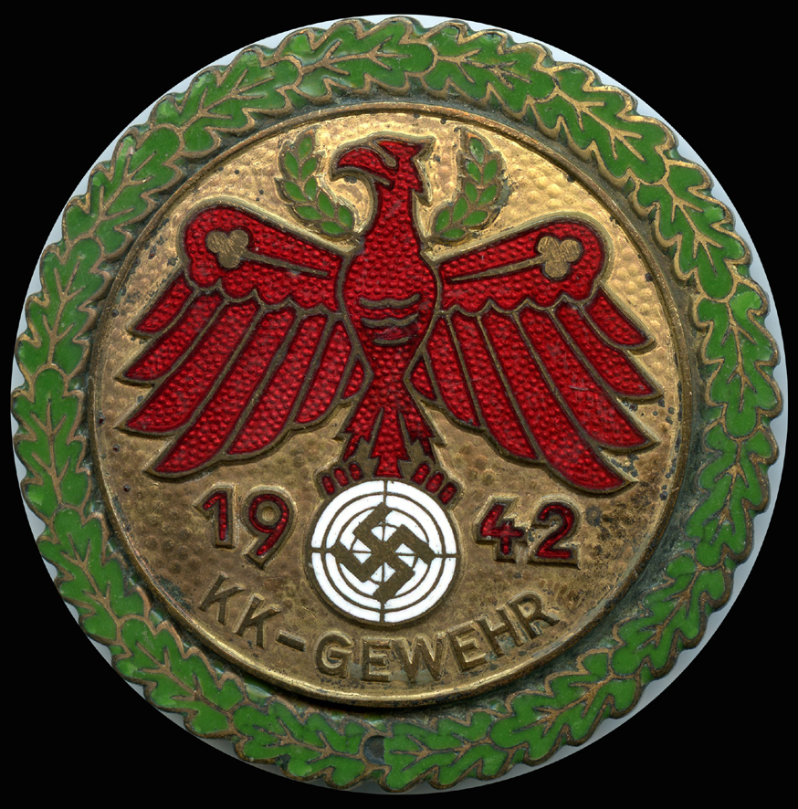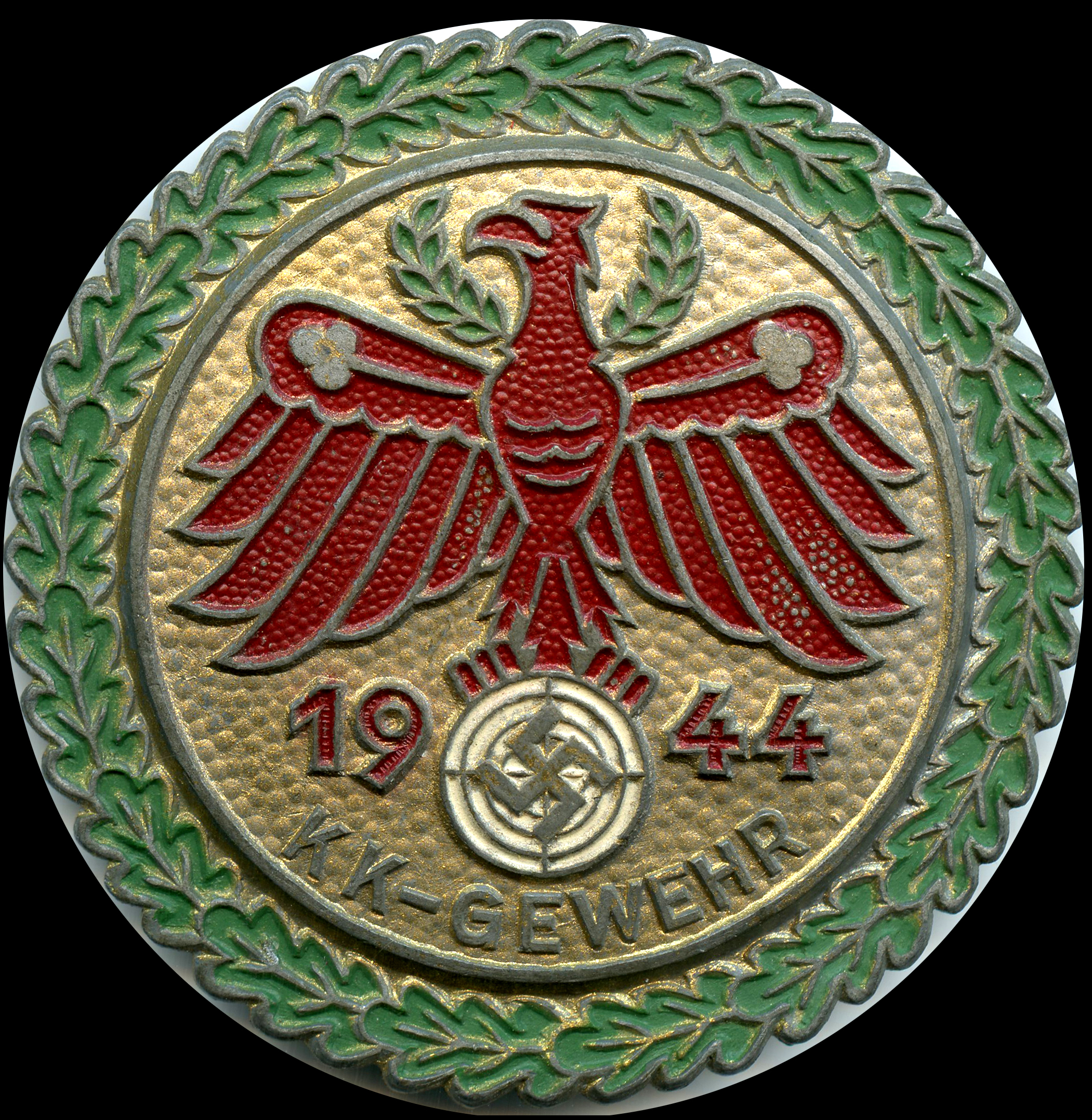 [Below: This is a 1944 shooting competition award. Close to the end, this late war pin lacks the enamel of previous awards.]