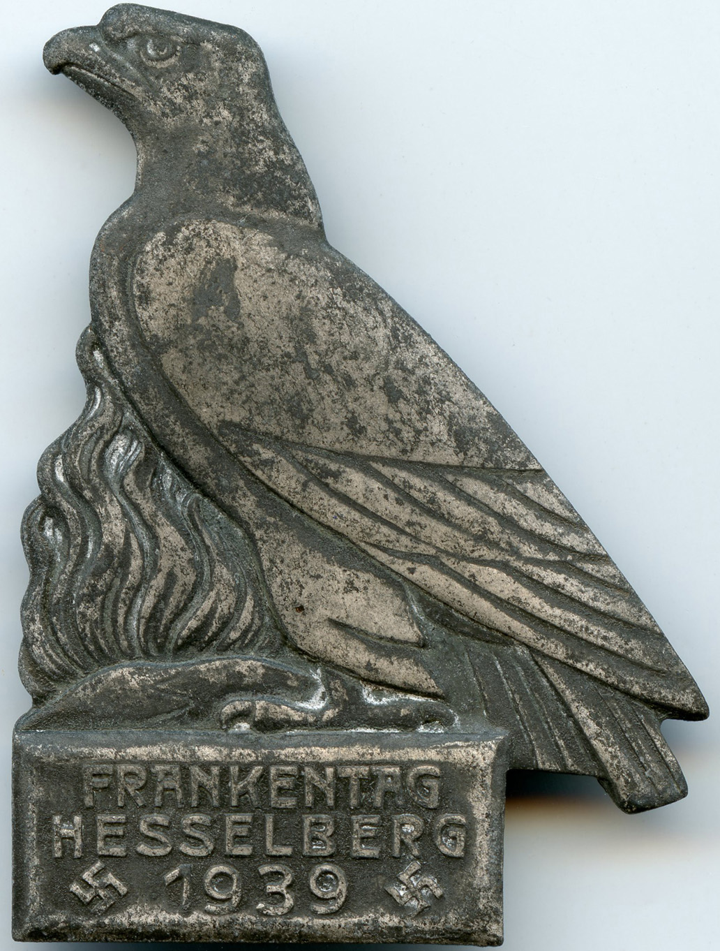 [Below: This tinnie, made from wartime zinc, says 'Frankentag - Hesselberg - 1939'.]