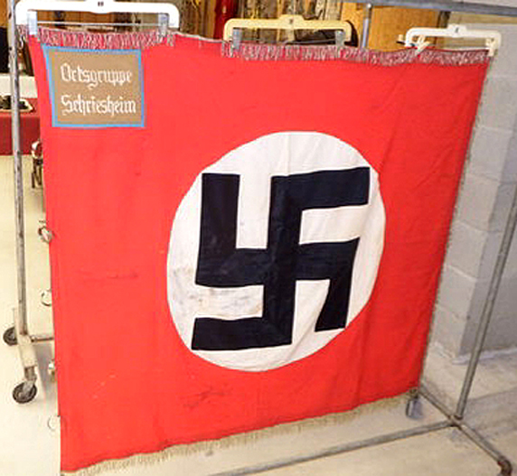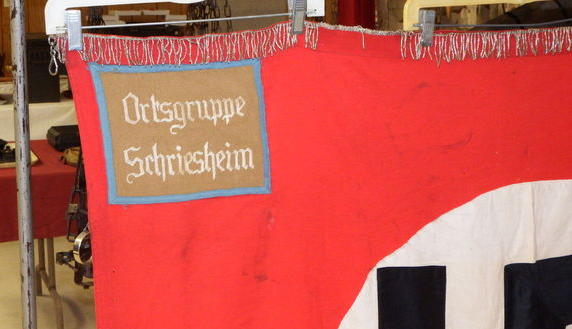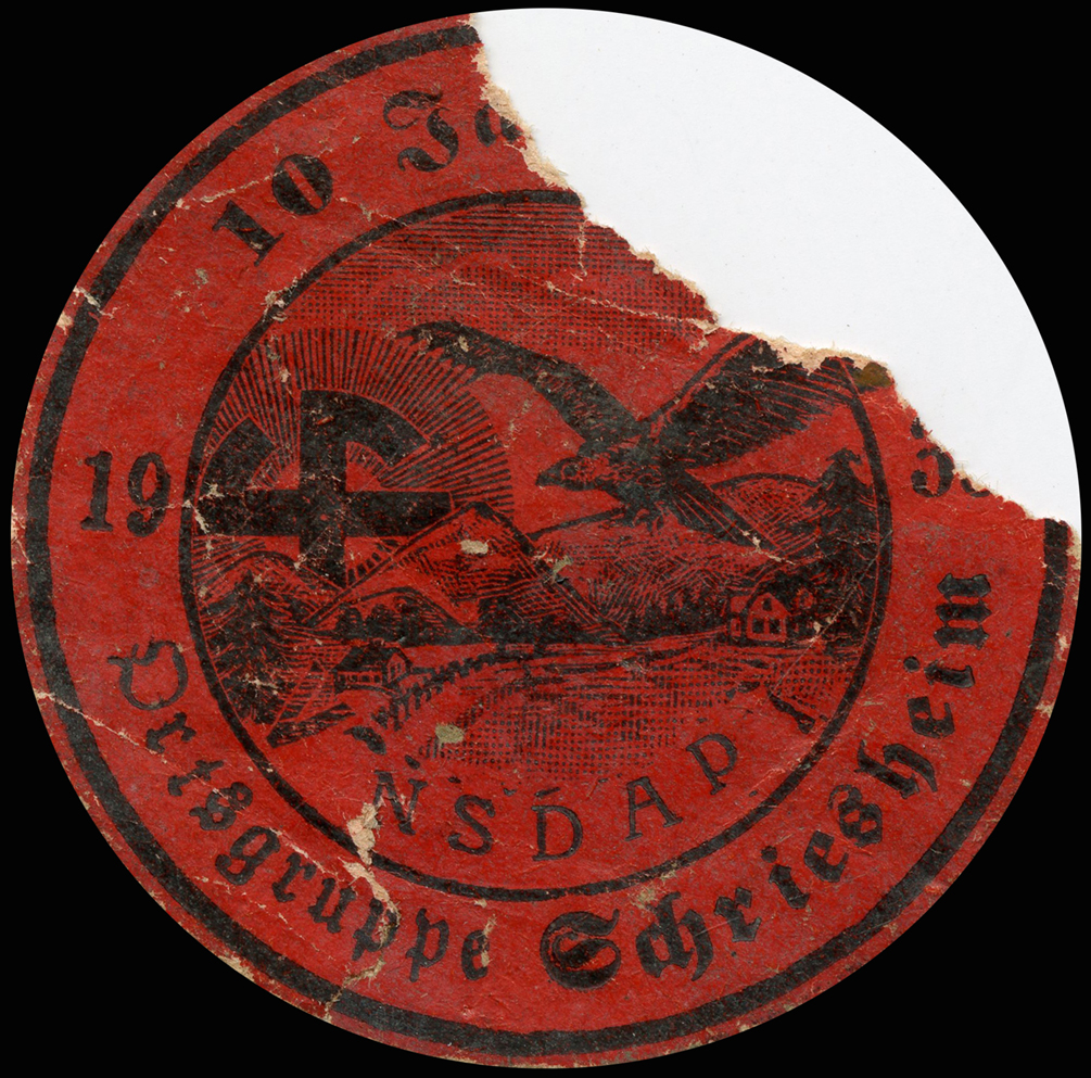 [Below: Ortsgruppe Schriesheim stamp. The years have been rough on this... yet over a period of 80 some years human beings continue to keep it. Nonetheless it is a very rare item. Schriesheim is a town located in Baden-Württemberg.]