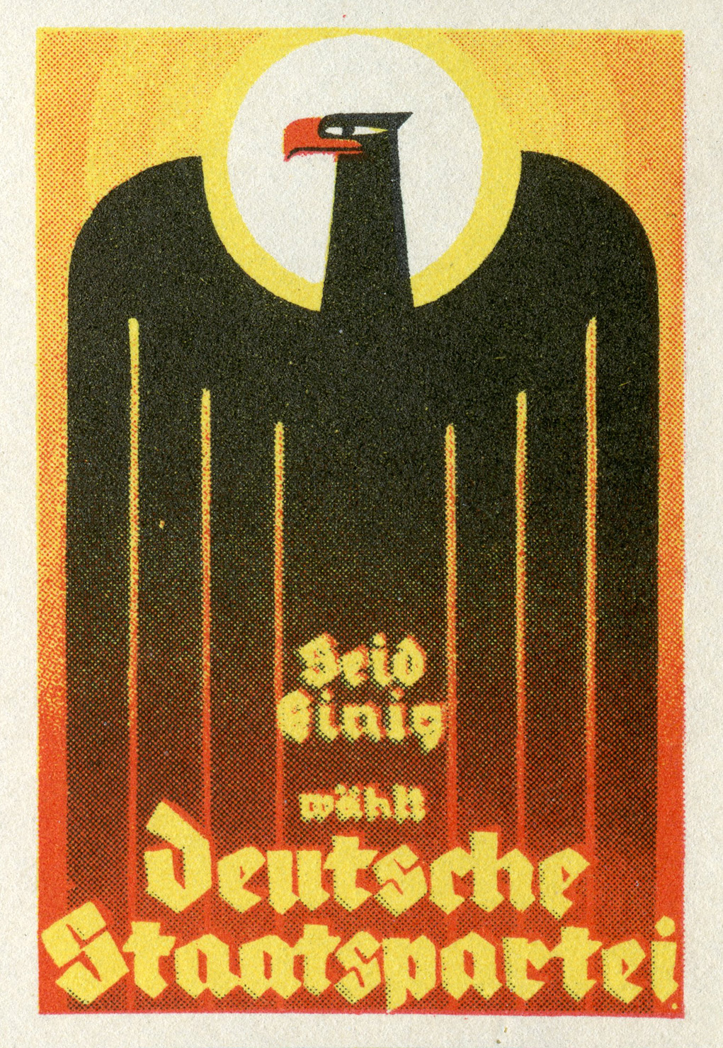 [Below: This is a very sly-looking eagle. It says 'Seid Einig wählt Deutsche Staatspartei' which means 'Be United, Vote German State Party'.]