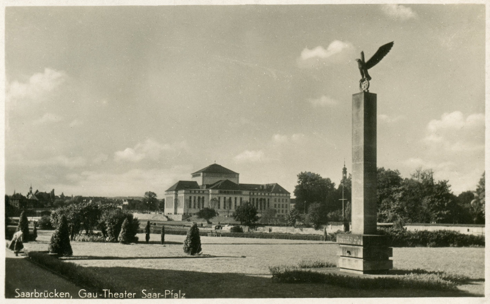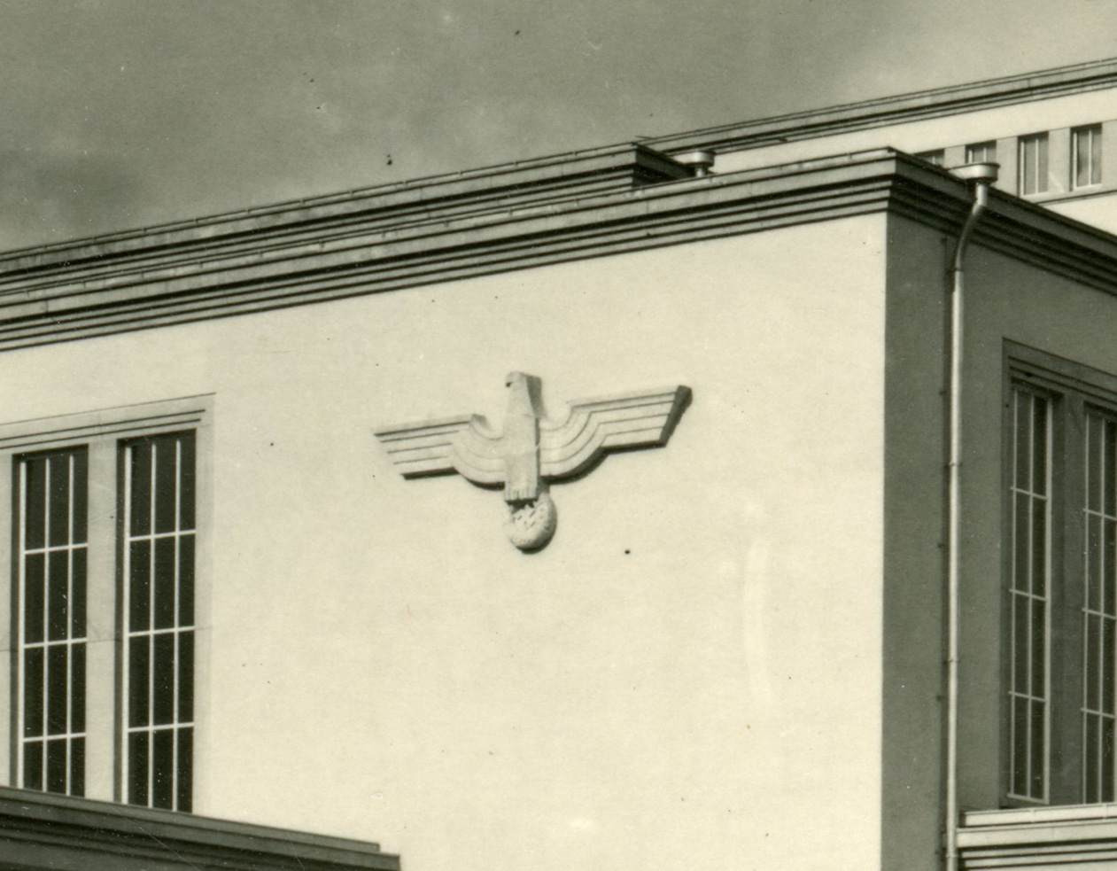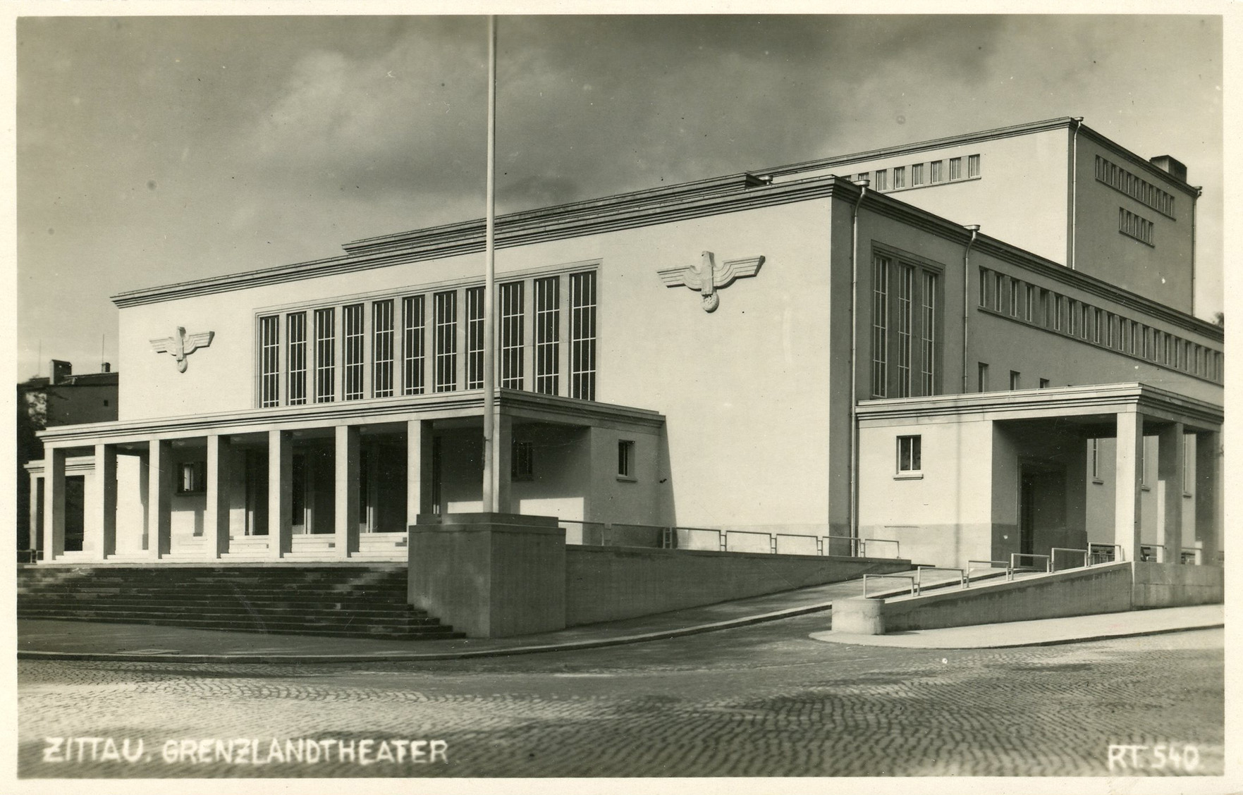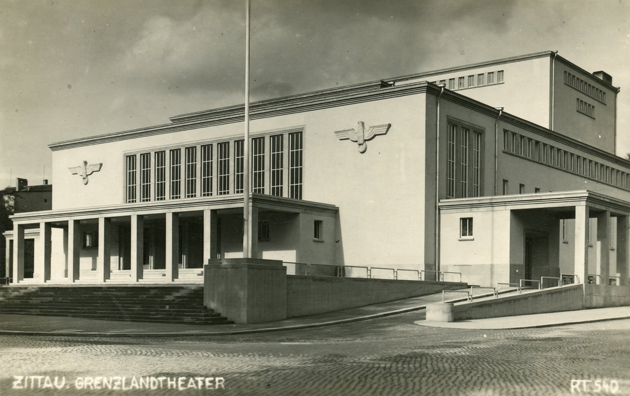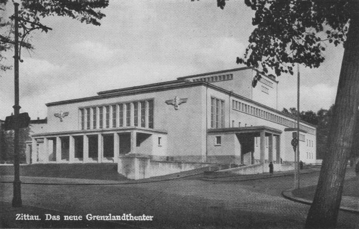 [Below: This is up there in the top ten of strange eagles. This is in Zittau, Saxony, in eastern Germany. This was built along with many, many other theaters by the National Socialists. The Grenzlandtheater survived the war and is still in operation today, but under a different name. Click to enlarge.]