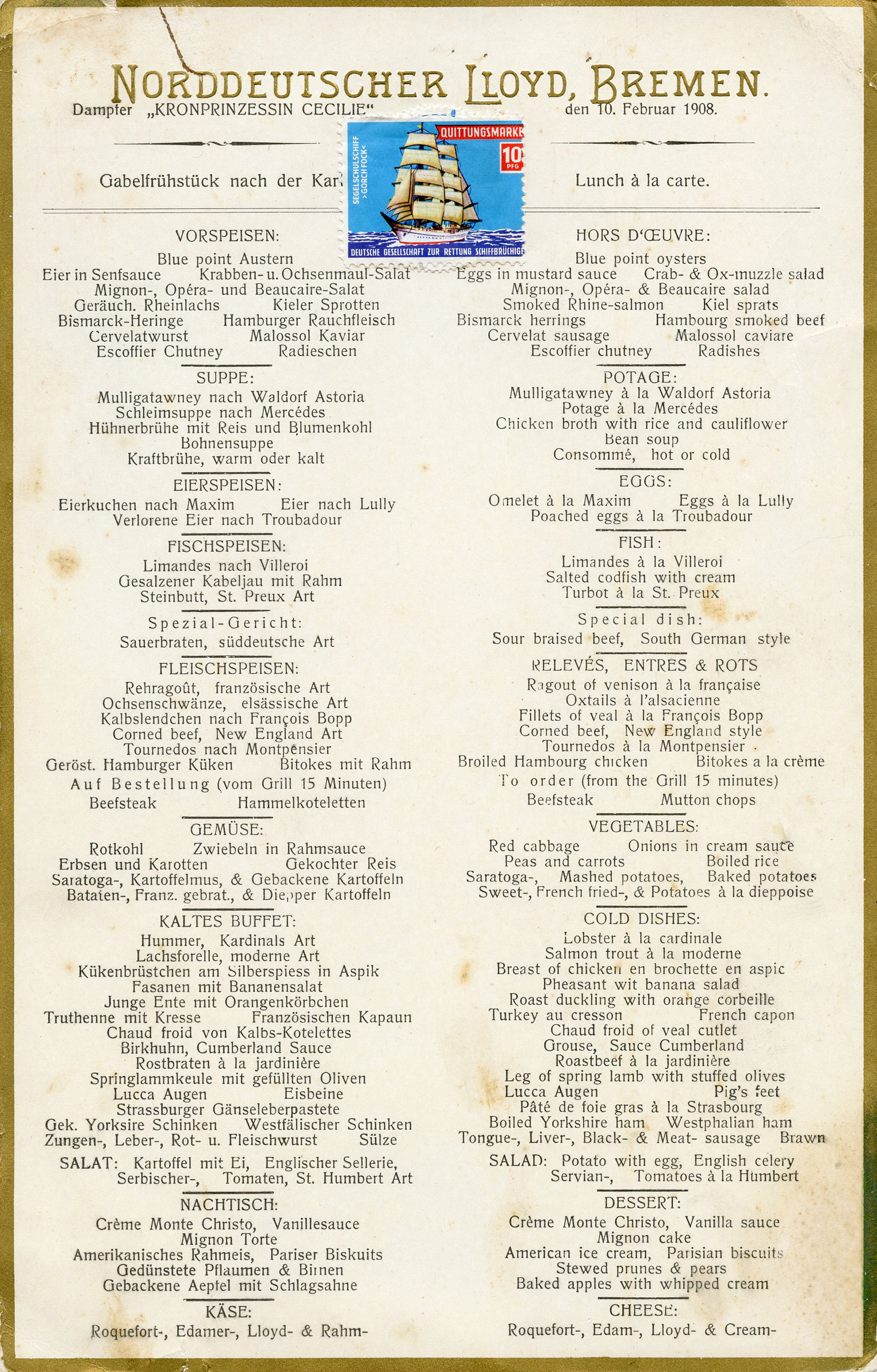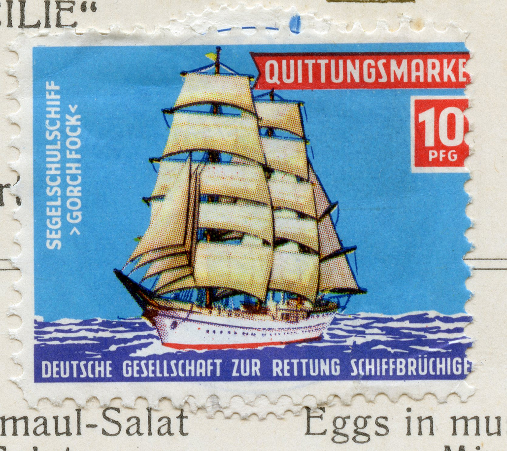 [Below: Close-up. This is interesting and I'm not sure why this is stuck to the menu. If you look carefully you can see another stamp is underneath this one. Strange. This says 'Deutsche Gesellschaft zur Rettung Schiffbrüchige' (German Society for the Rescue of Shipwrecked People). Pretty neat. Click to enlarge.]