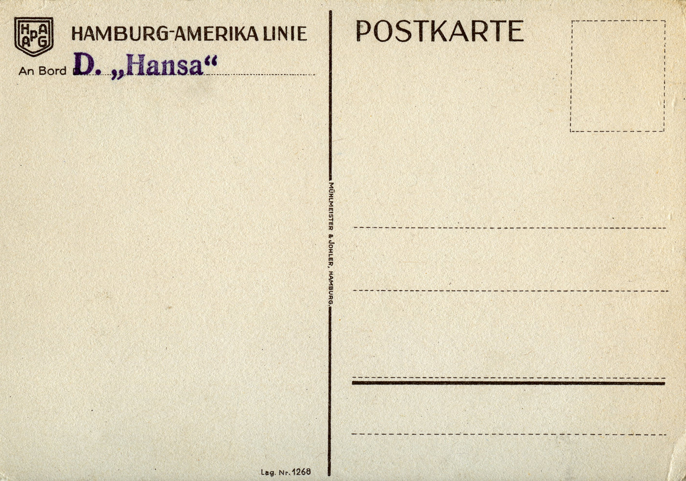 [Below: Postcard of the 'Hansa'. This ship was built in 1923 and was sunk by a mine in the Baltic Sea on March 6, 1945. In 1949 the Russians raised it and repaired it, renaming it Sovetsky Sojus.]