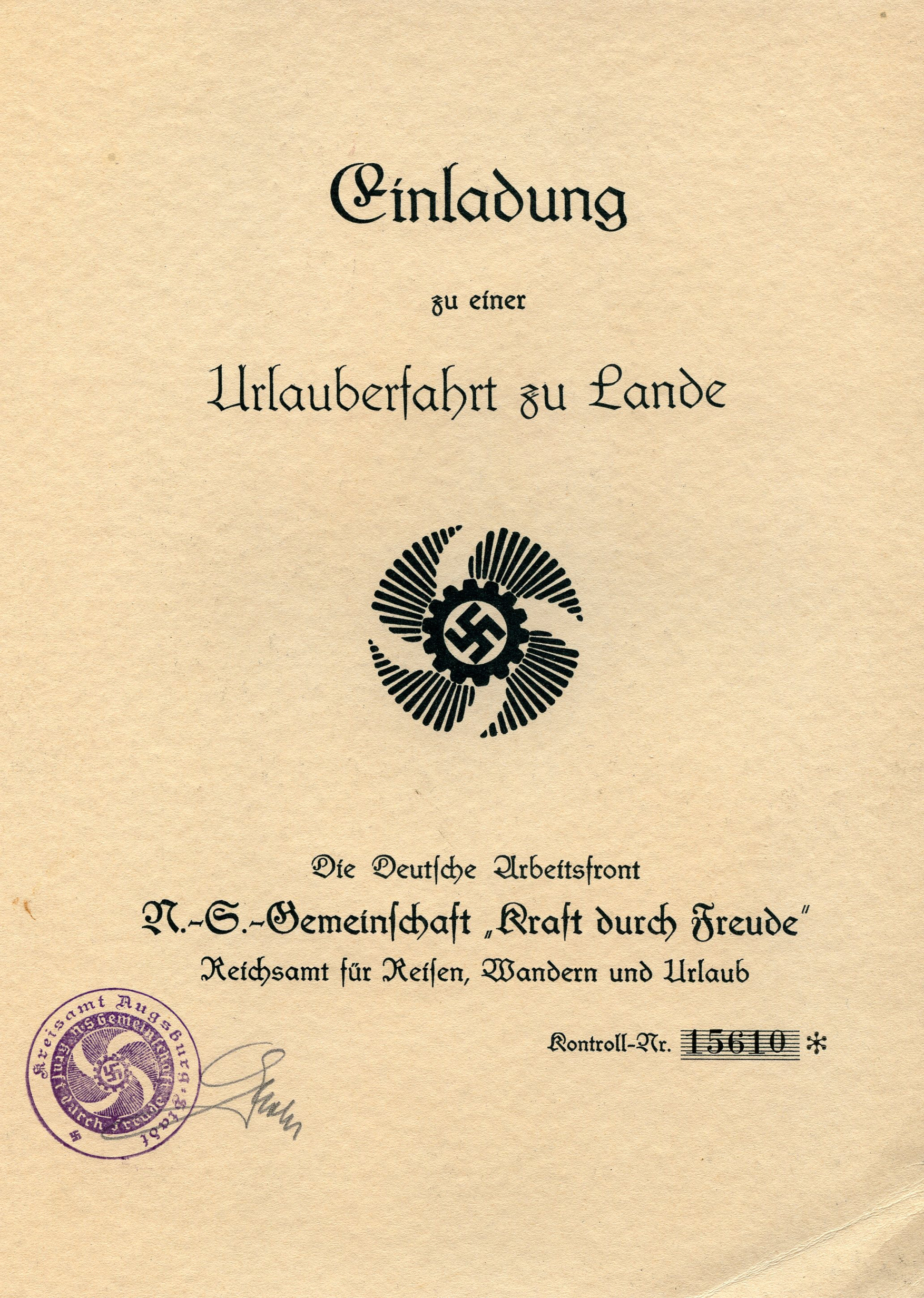 [Below: This Strength Through Joy is a large two-sided card. It says: 'Einladung zu einer Urlauberfahrt zu Lande' (Invitation to a holiday trip on land).]