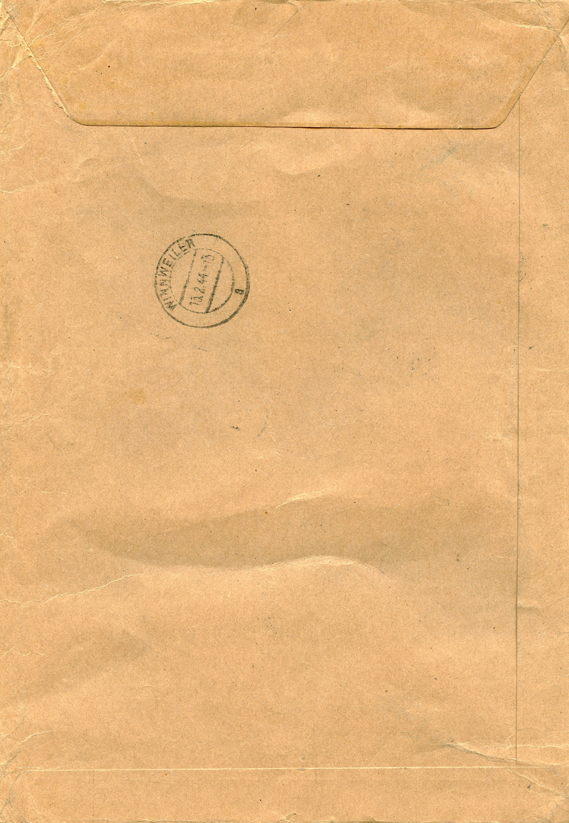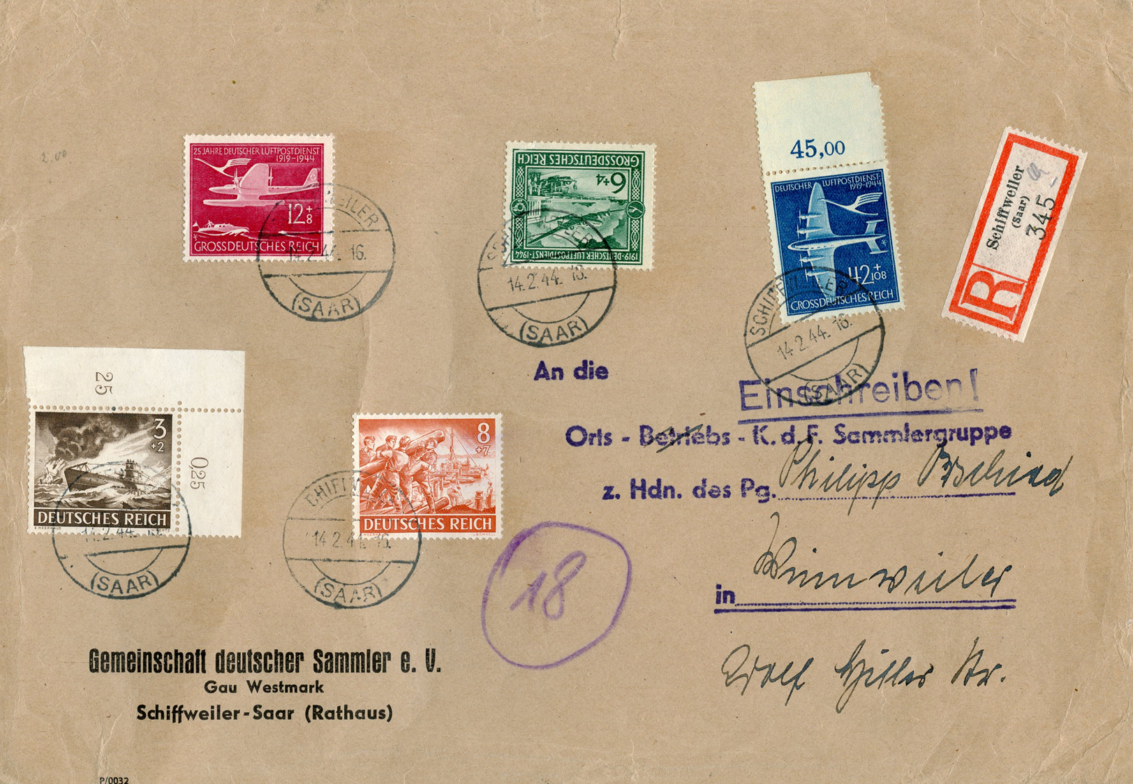 [Below: This was sent registered to the Strength Through Joy organization from the Saar on February 14, 1944.]