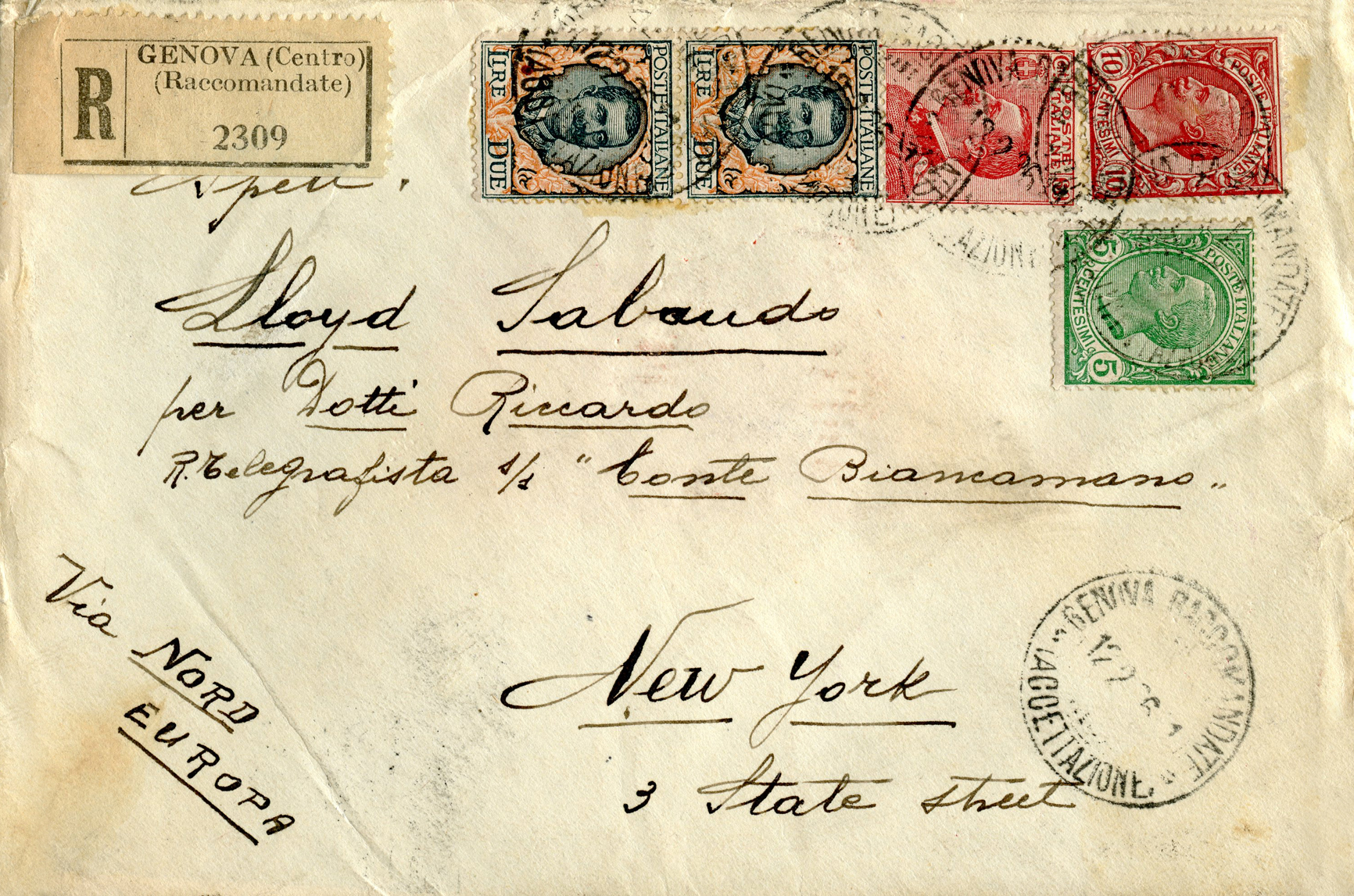 [Below: This was sent from the Conte Verde of the Lloyd Sabaudo shipping line, in an official envelope, to another ship of the LLoyd Sabaudo Line, c/o Dotti Ricccardo, the radio telegrapher of the S.S. Conte Biancamano, harbored in New York. It was sent registered from Genova, Italy on February 12, 1926, and received in New York on February 24, 1926.