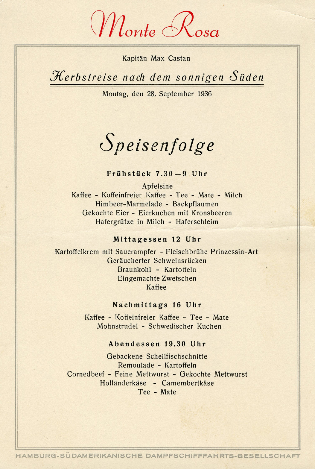 [Below: This is a menu from the 'Monte Rosa' ship on a KDF cruise on September 26, 1936.]