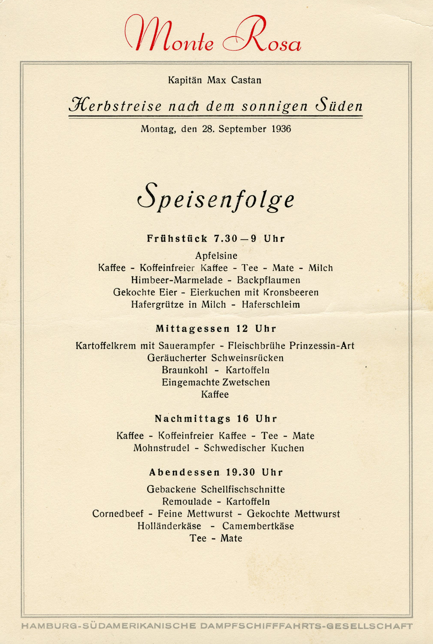 [Below: This is the menu from the next day on the 'Monte Rosa' ship on a KDF cruise on September 28, 1936 .]
