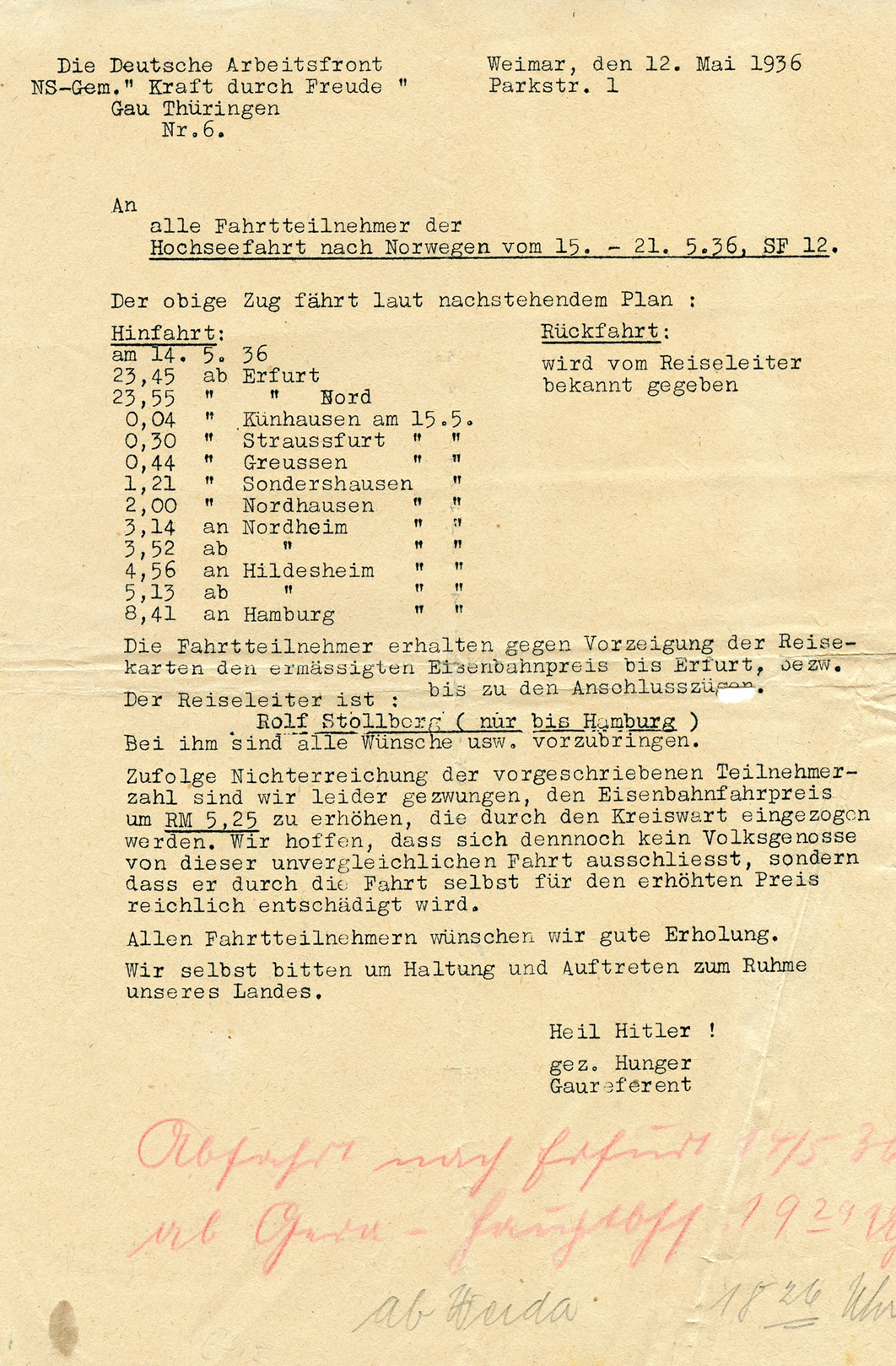 [Below: This is a train schedule for a May 1936 Strength Through Joy cruise.]