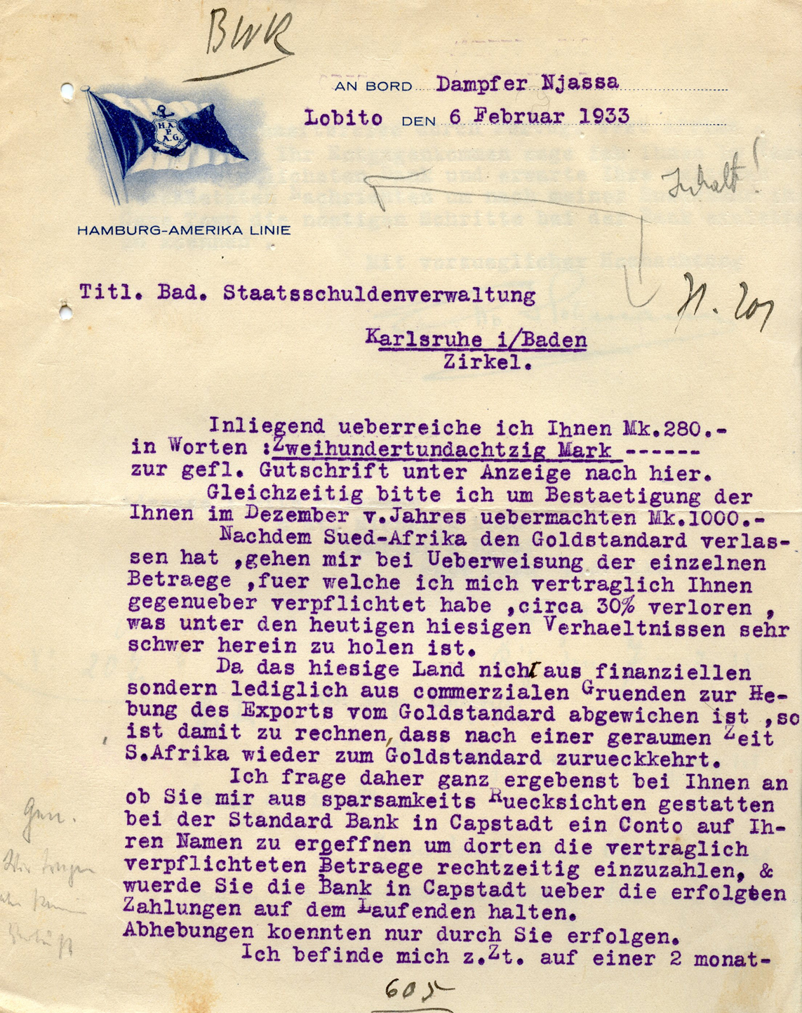 [Below: This is a letter, on Hamburg-America Line stationary, from the 'Dampfer Njassa' ship from February 6, 1933. Click to see more.]