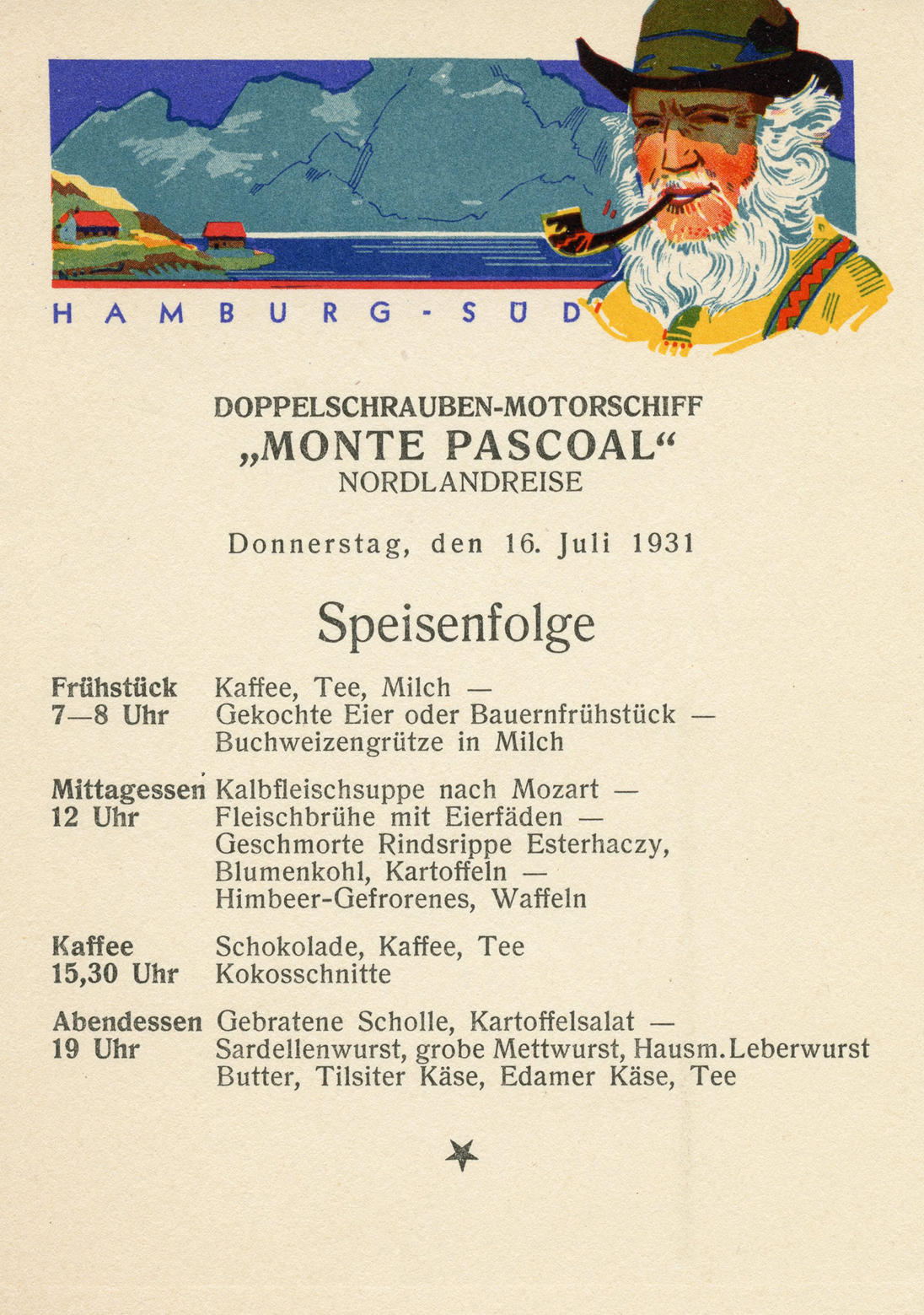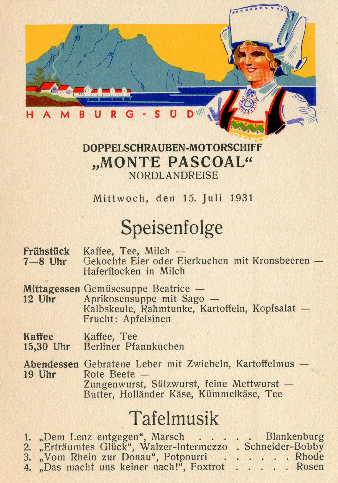 [Below: Menu postcard from a cruise on the 'Monte Pascoal' from July 21, 1931. Click to enlarge.]