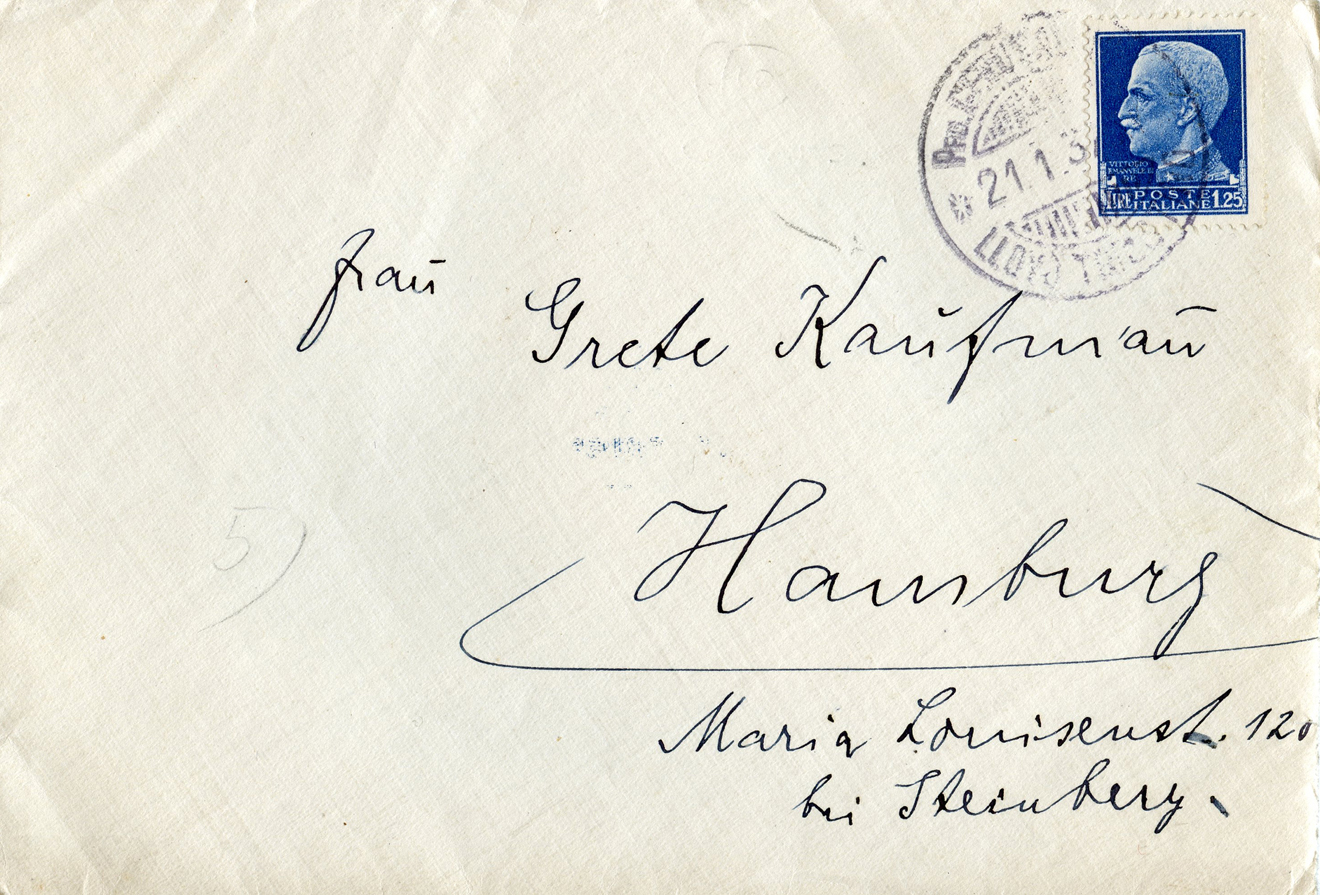 [Below: Postmarked in Italy on January 21, 1937 and sent from the S.S. Lloyd Triestino to Hamburg, Germany. Click to enlarge.]