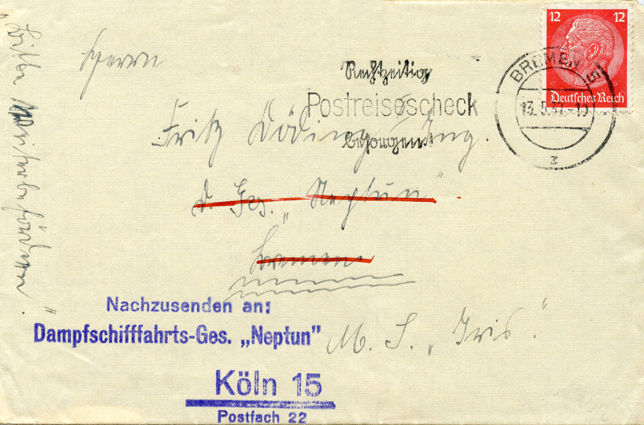 [Below: Postmarked in Bremen, on May 13, 1937, to a steamer ship then re-directed to the S.S. Neptun ship. Click to enlarge.]