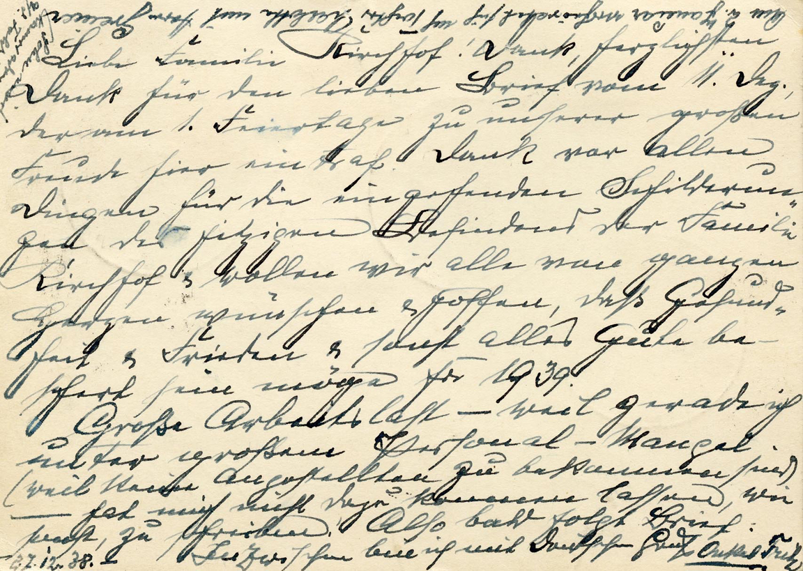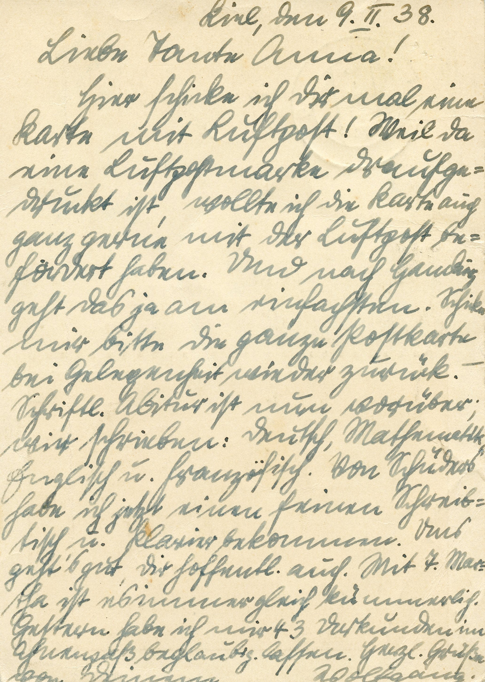 [Below: Same postcard but with additional airmail stamp sent on February 10, 1938.]