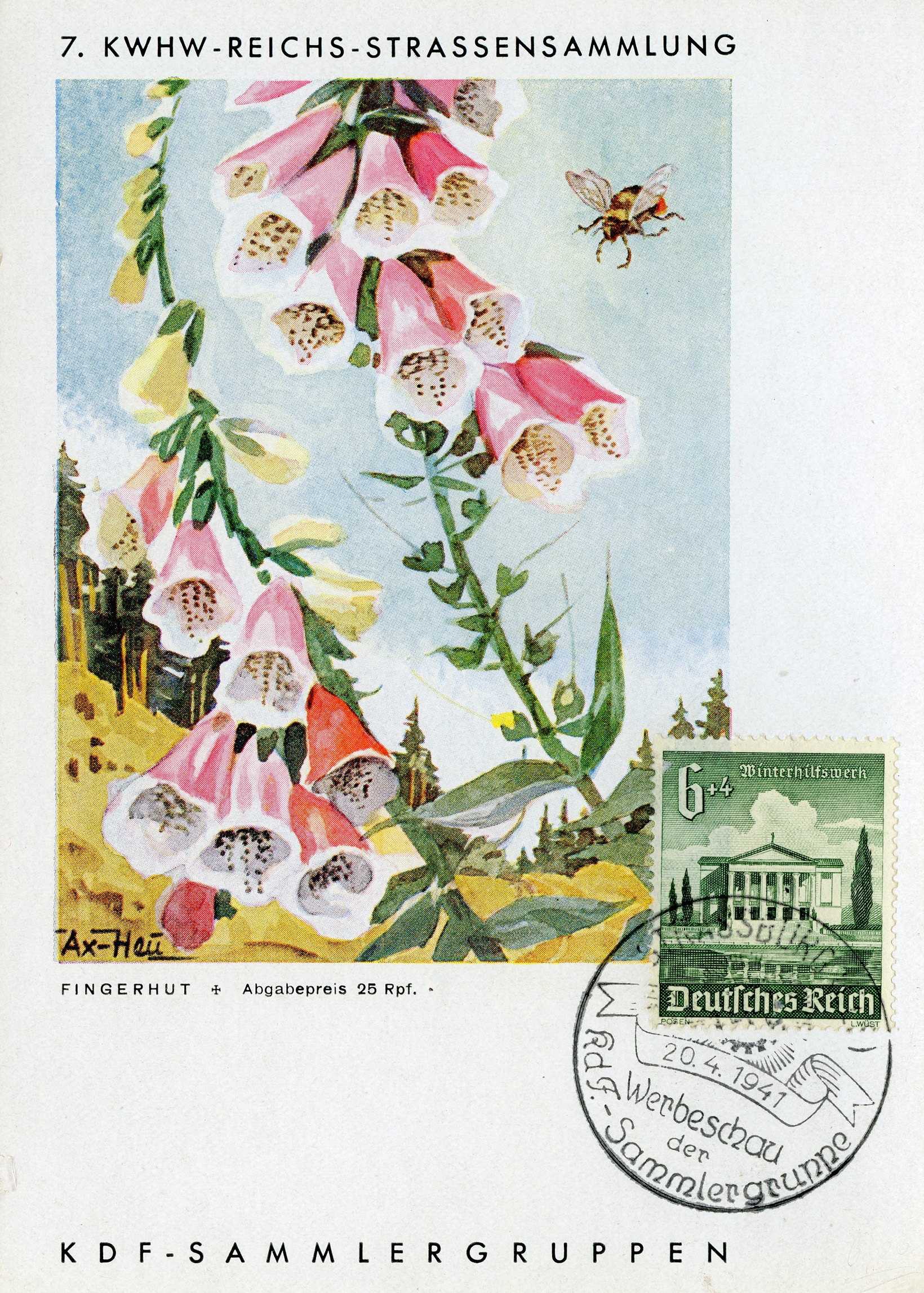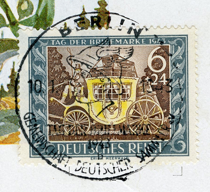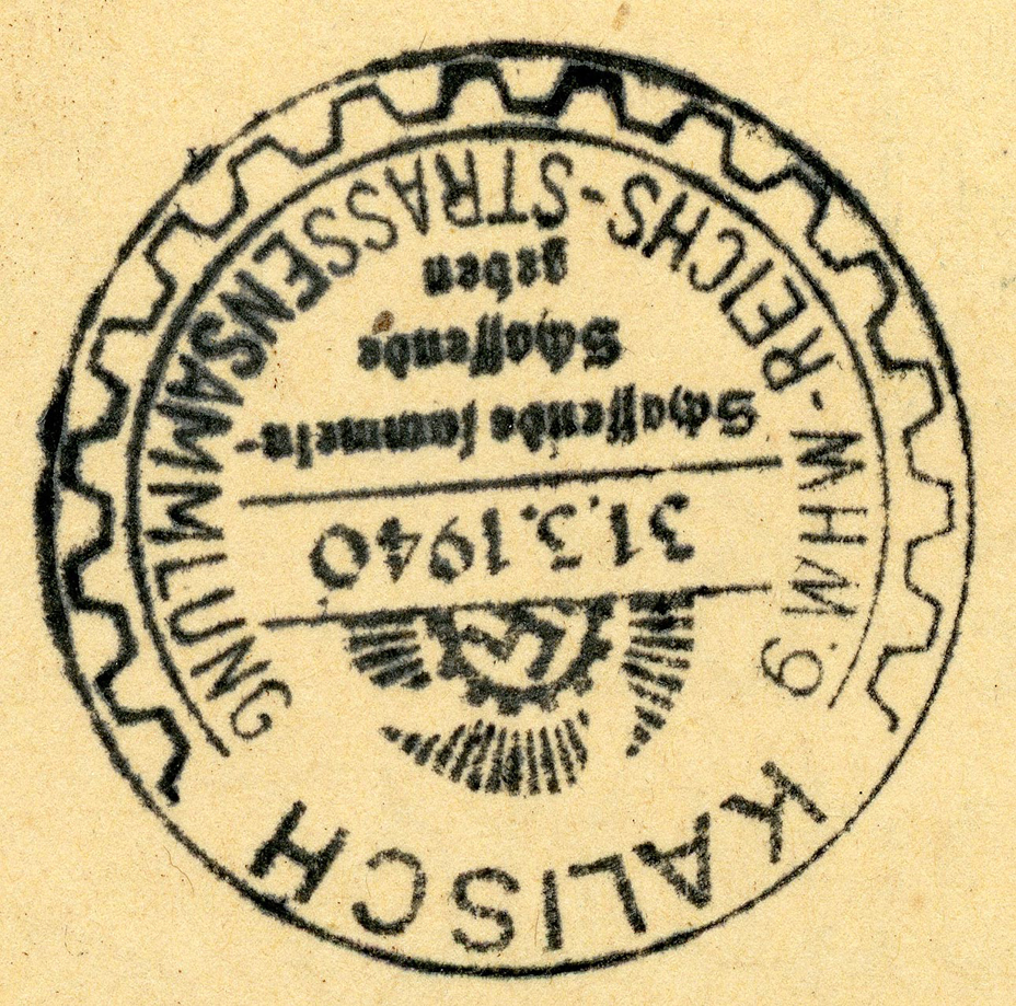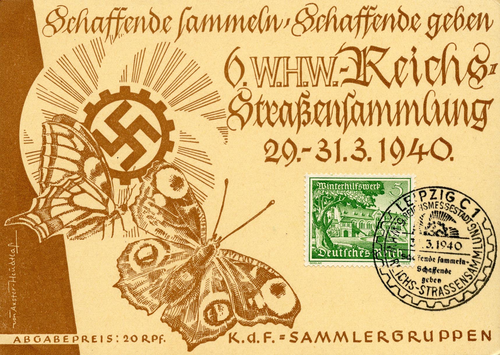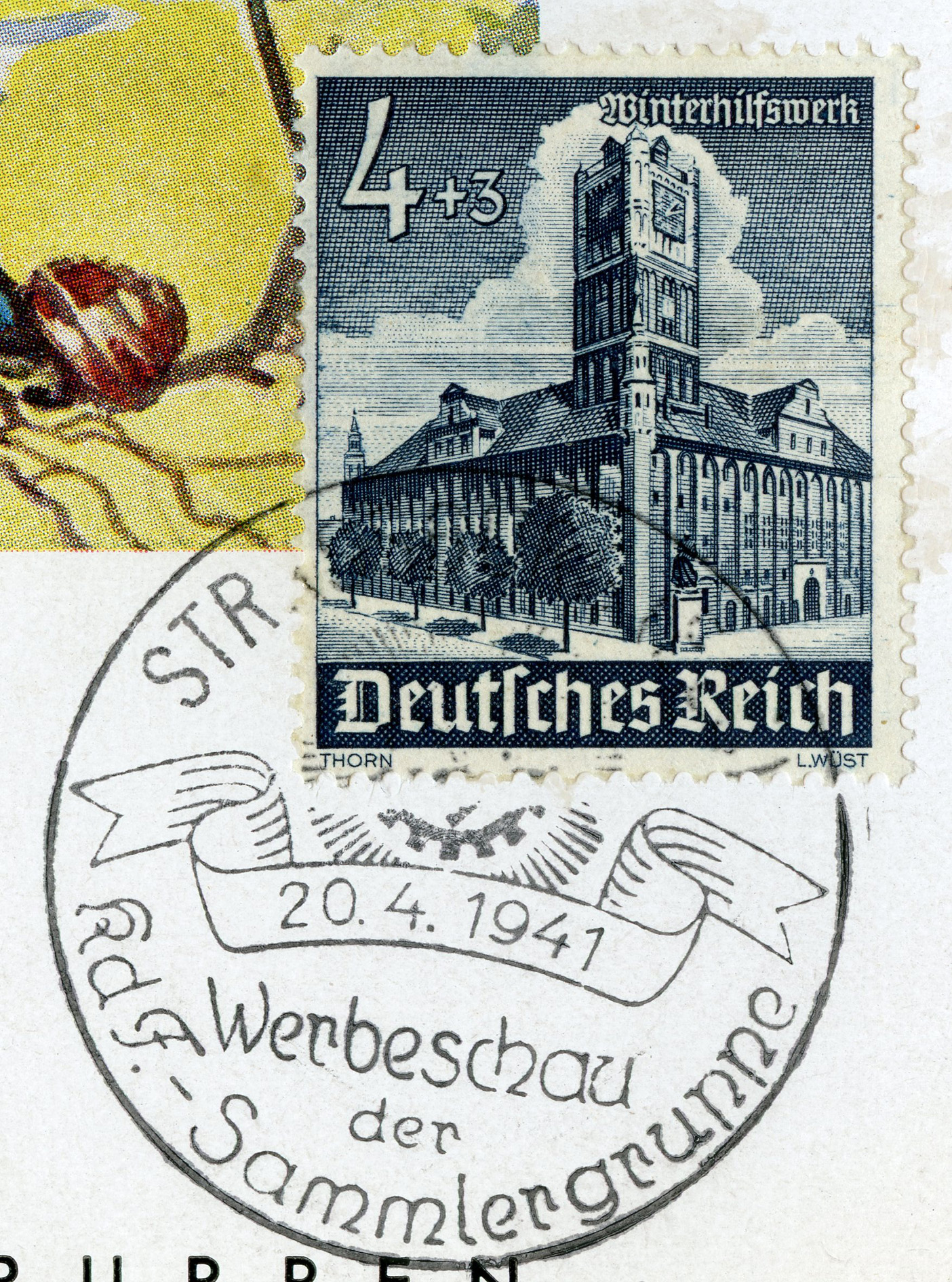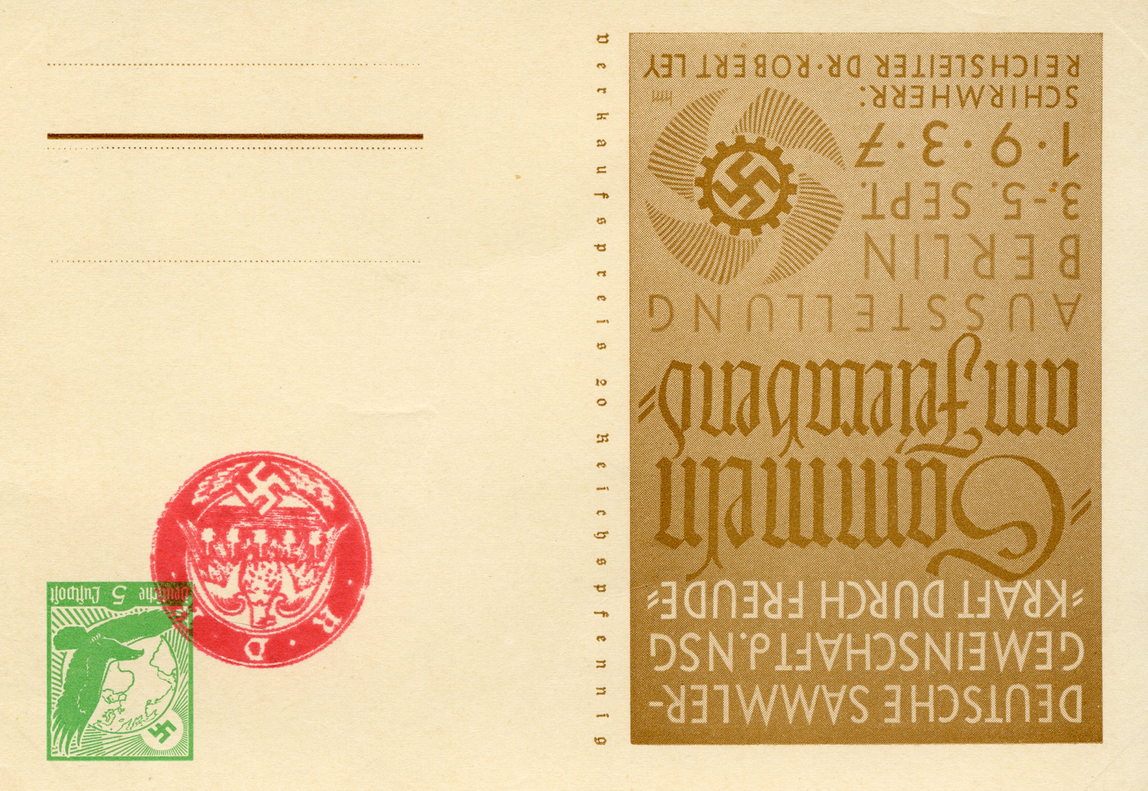 [Below: This postcard, postmarked on October 27, 1940, is adverising a stamp collectors show, at the top it says: 'Sammlerschau der KdF Ortssammlergruppe' (Collector's show of the KdF local collector group). At the bottom it says: 'Erste Briefmarkenausstellung der Ortssammlergruppe Berlin=Schöneberg in der NS.=Gemeinschaft "Kraft durch Freude" am 26. und 27. October 1940 im alten Schöneberger Rathaus' (First stamp exhibition of the local collector group Berlin=Schöneberg in the NS.=Community "Strength through Joy" on October 26th and 27th, 1940 in the old Schöneberg town hall).]
