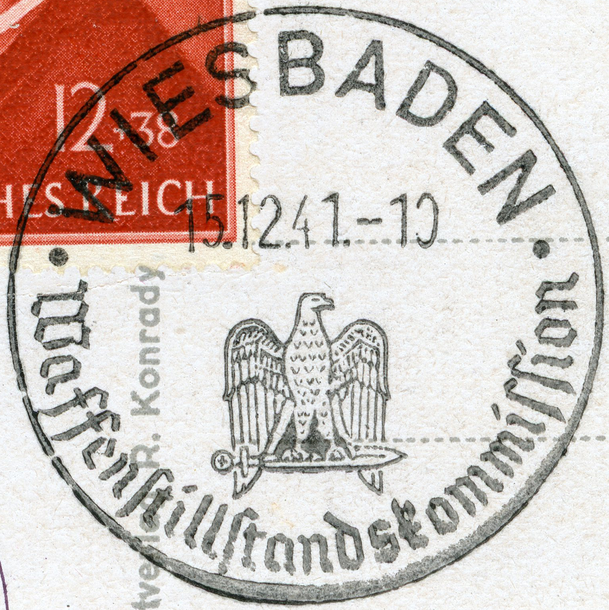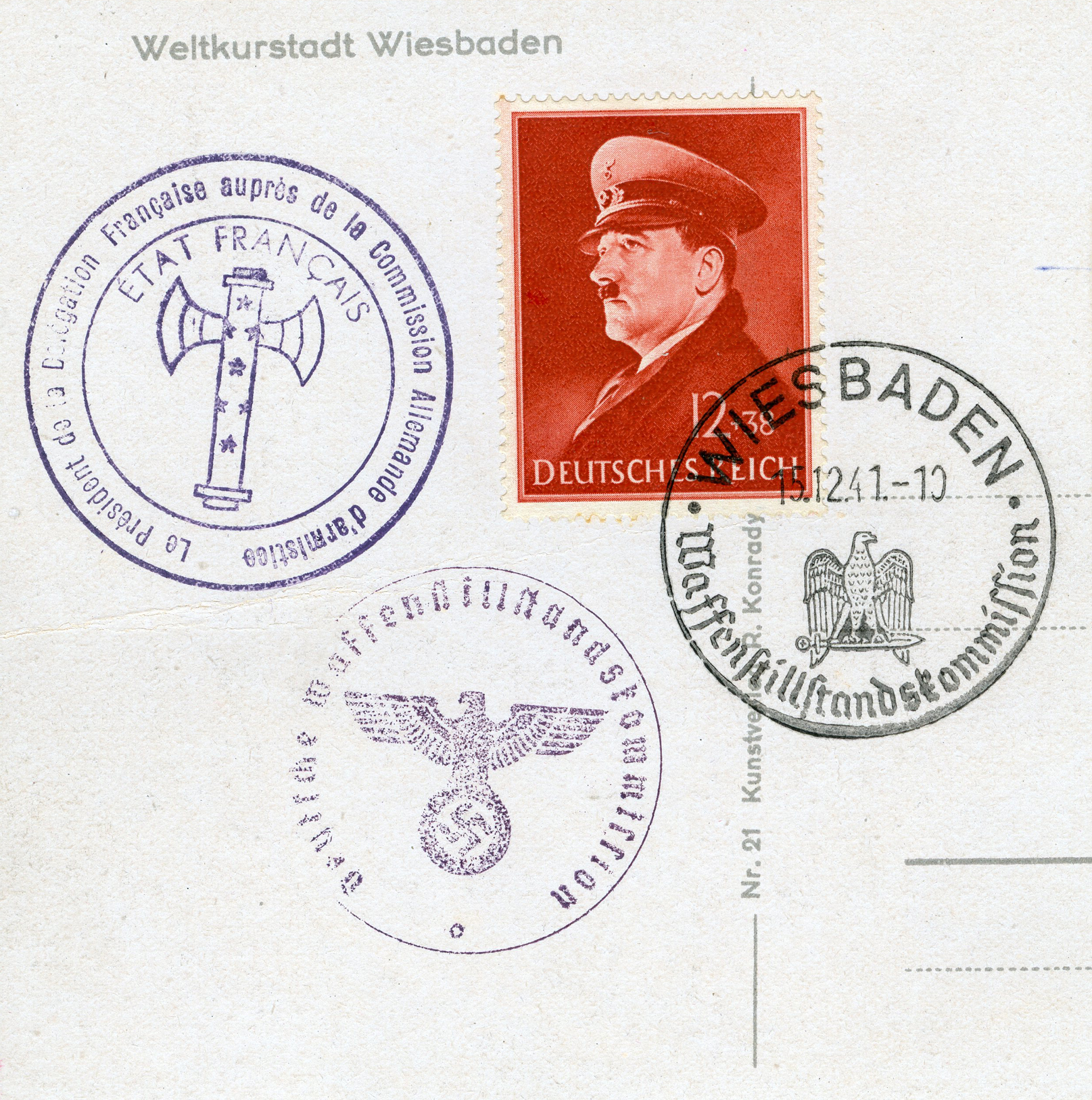 [Below: The Vichy cancel is from a partial postcard (seen below) with a German 1941 Adolf Hitler postage stamp and cancel, plus a Feldpost ink stamp.]