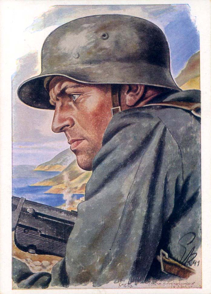 [Below: 'Fighter of Crete' by artist Ernst Kretschmann, 1941, published by Heinrich Hoffmann, Munich, no. 200.]