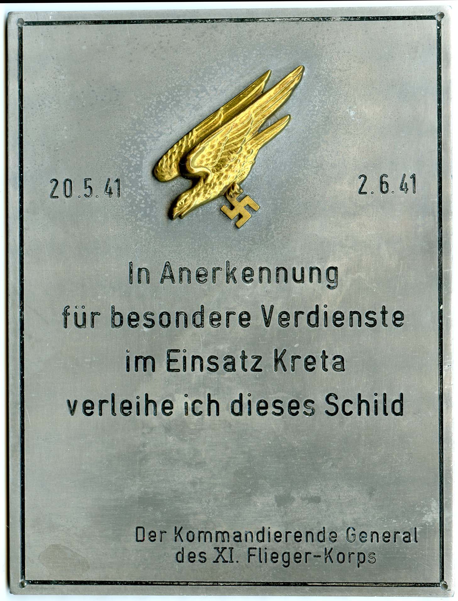 [Below: This aluminum award plaque says: 'In Anerkennung für besondere Verdienste im Einsatz Kreta verleihe ich dieses Schild' (In recognition of special merits in the mission of Crete, I award this shield).]
