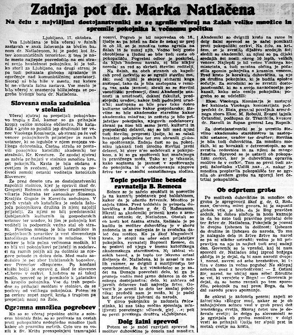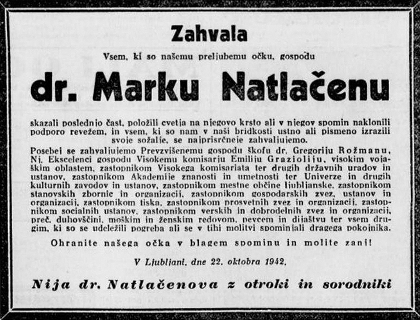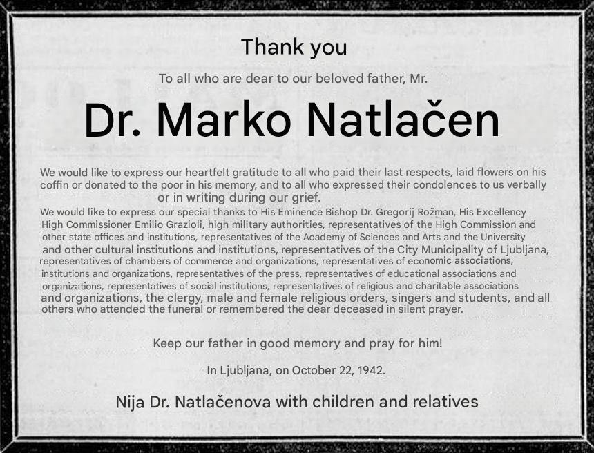 [Below: Newspaper (Slovenec) dedication to Marko Natlacen by his family, October 25, 1942.]