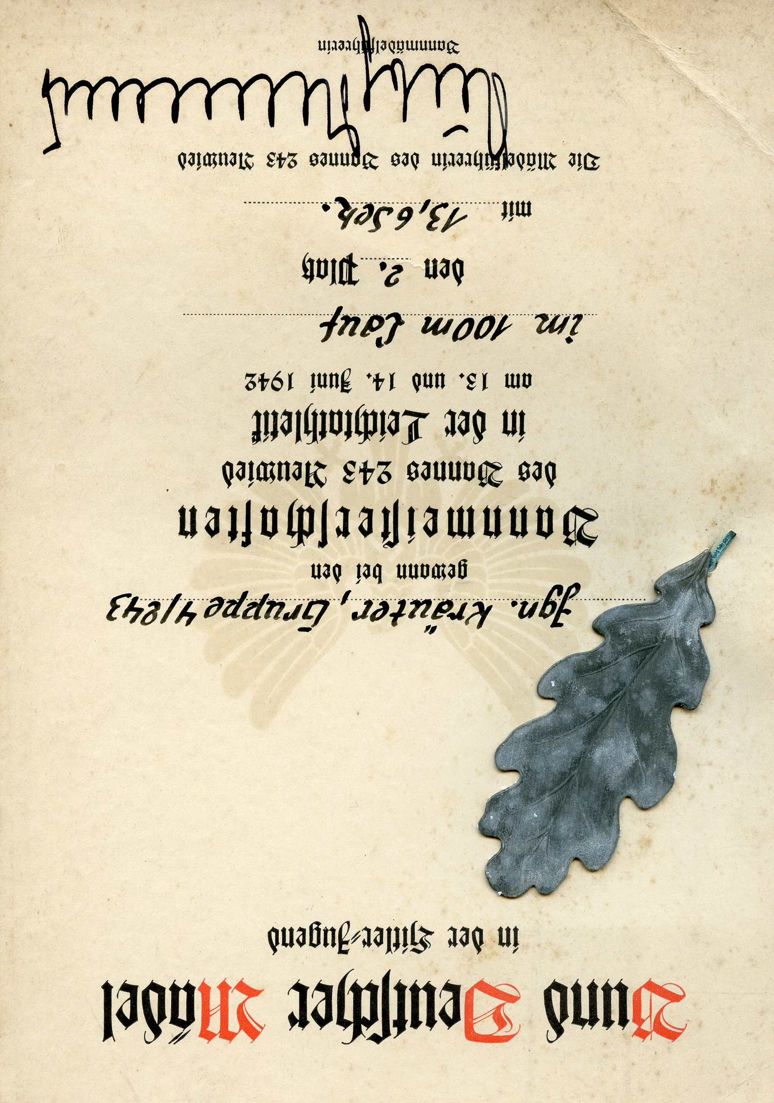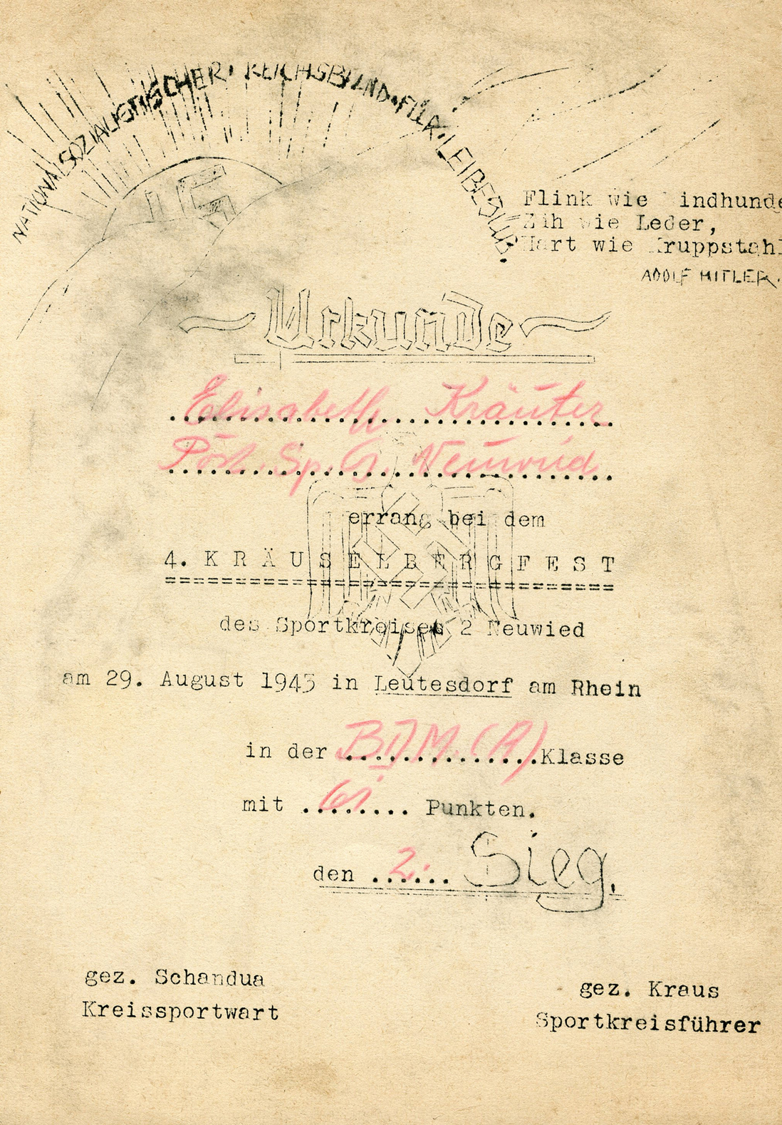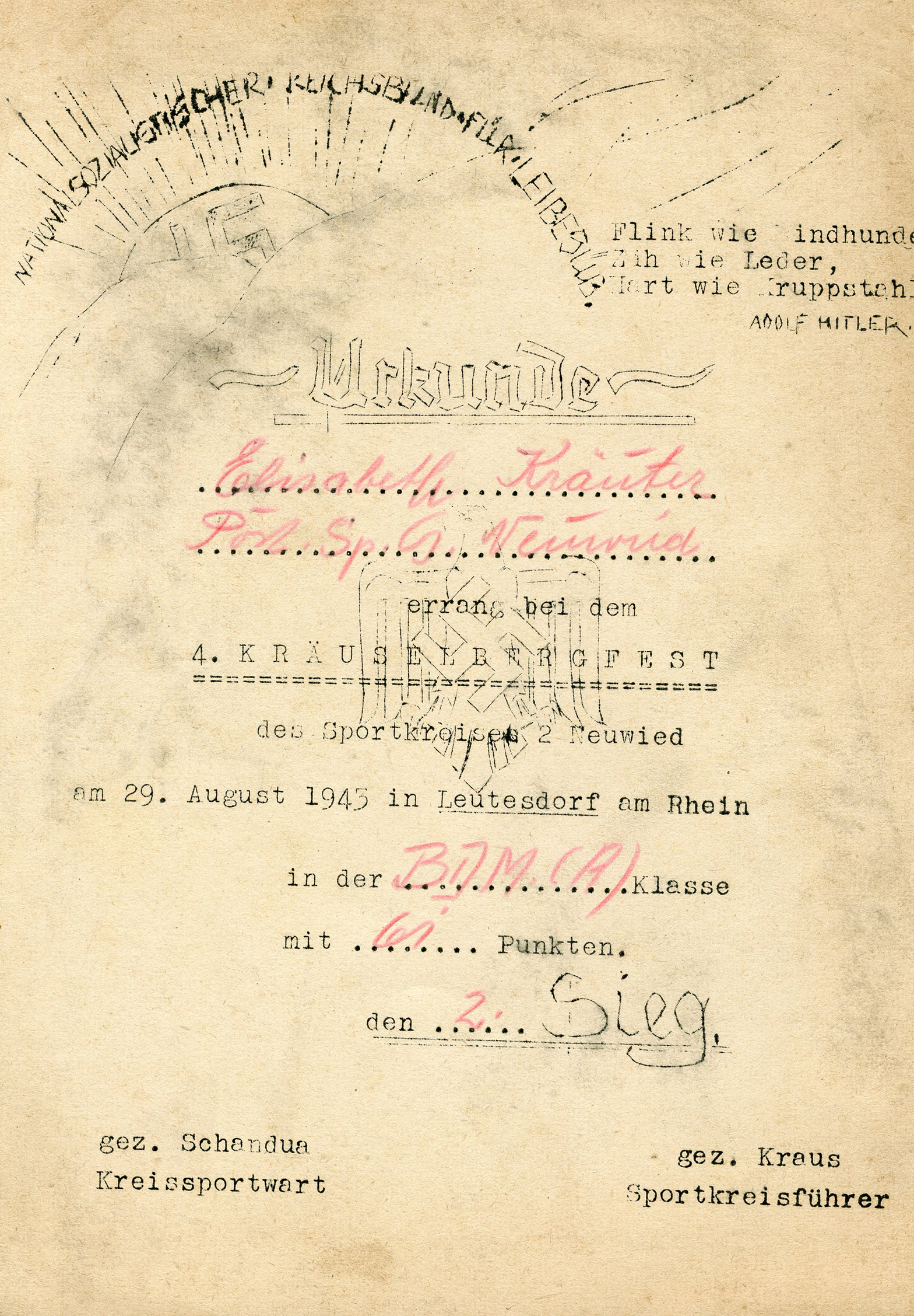 [Below: I was pleased to find more award documents from Elisabeth's sister, Helma! This first certificate was awarded to Helma for 2nd place in the 100m race, dated June 13-14, 1942.]