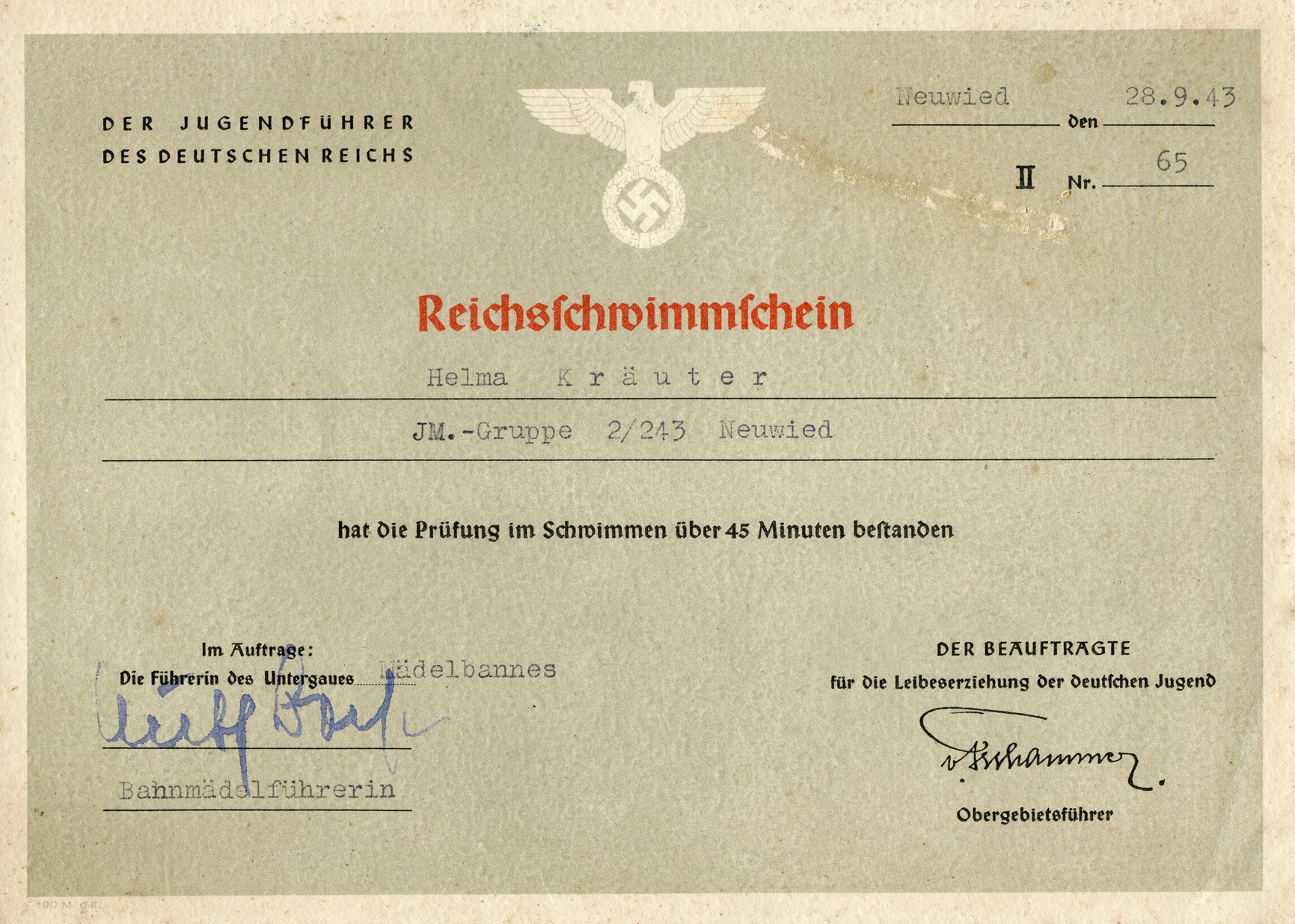 'Mit Wirkung vom 20.4.43 wurdest Du als JM-Schaftführerin bestätigt. Es soll dies ein Ansporn für Deine weitere Arbeit sein.'