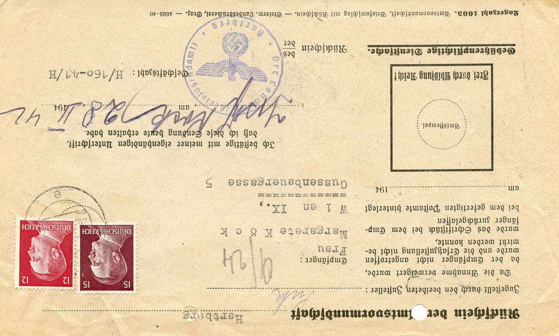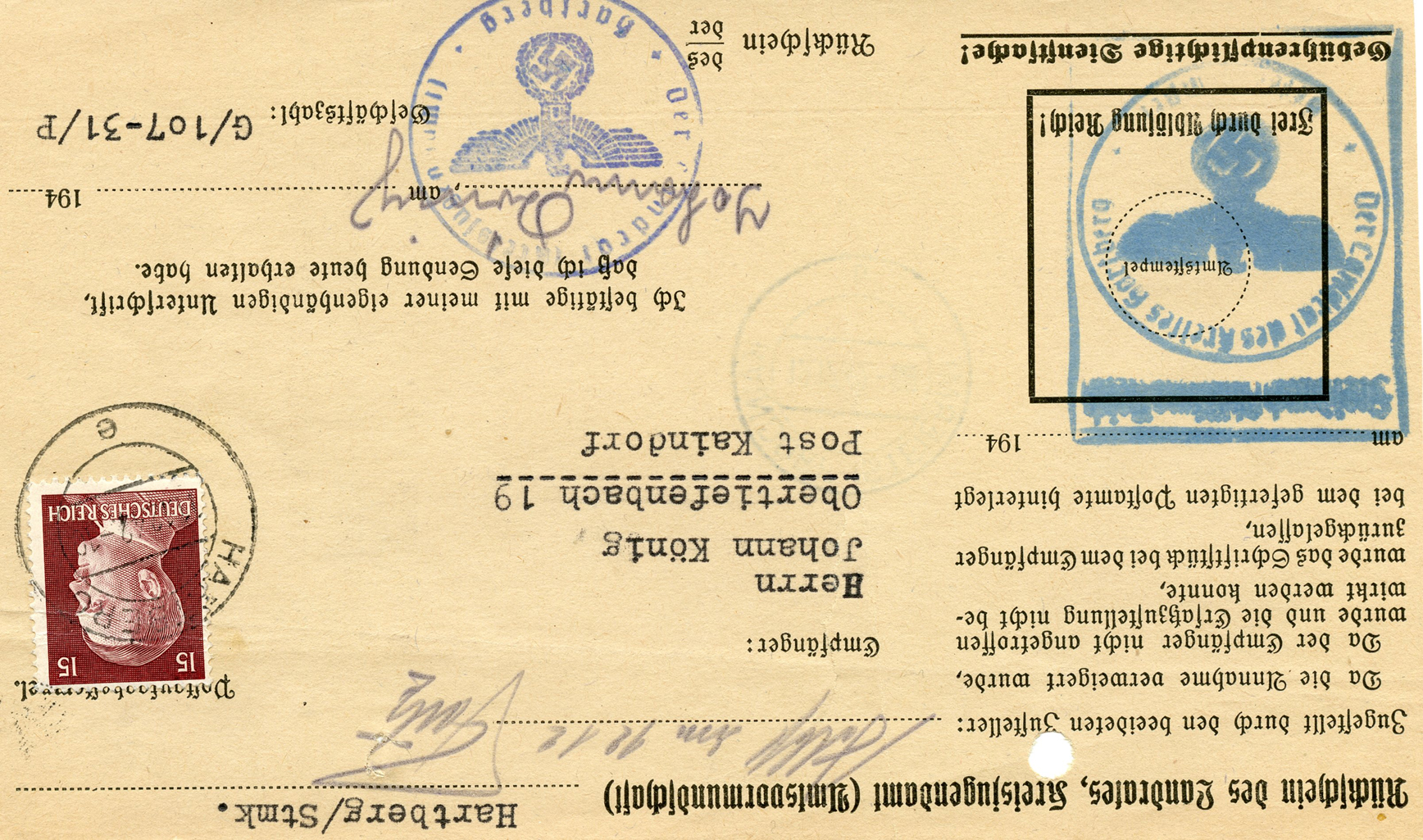 [Below: Here are a variety of postal forms and receipts. This first one is a 'cash on delivery (COD)' receipt from St. Pölten, January 4, 1943.]