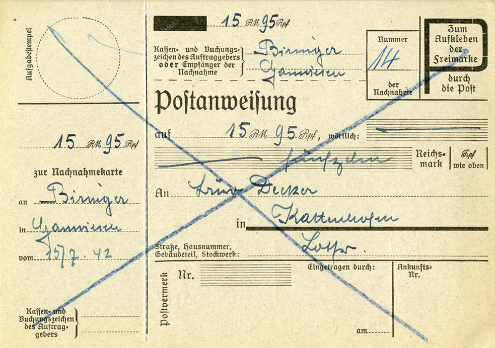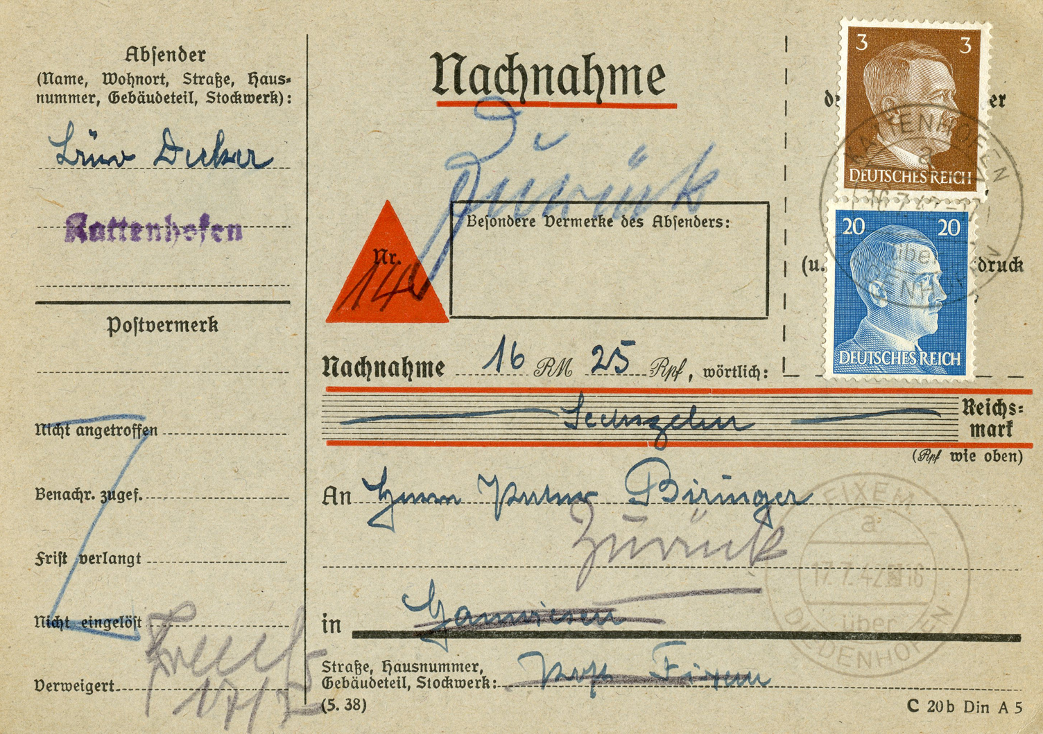 [Below: This is another 'cash on delivery (COD)' receipt, not sure why it is a different color than those above, maybe because it is a year later? Note in blue (under Nachnahme) is the word 'Zurück', this means 'return', meaning they couldn't find the addressee. July 17, 1942.]