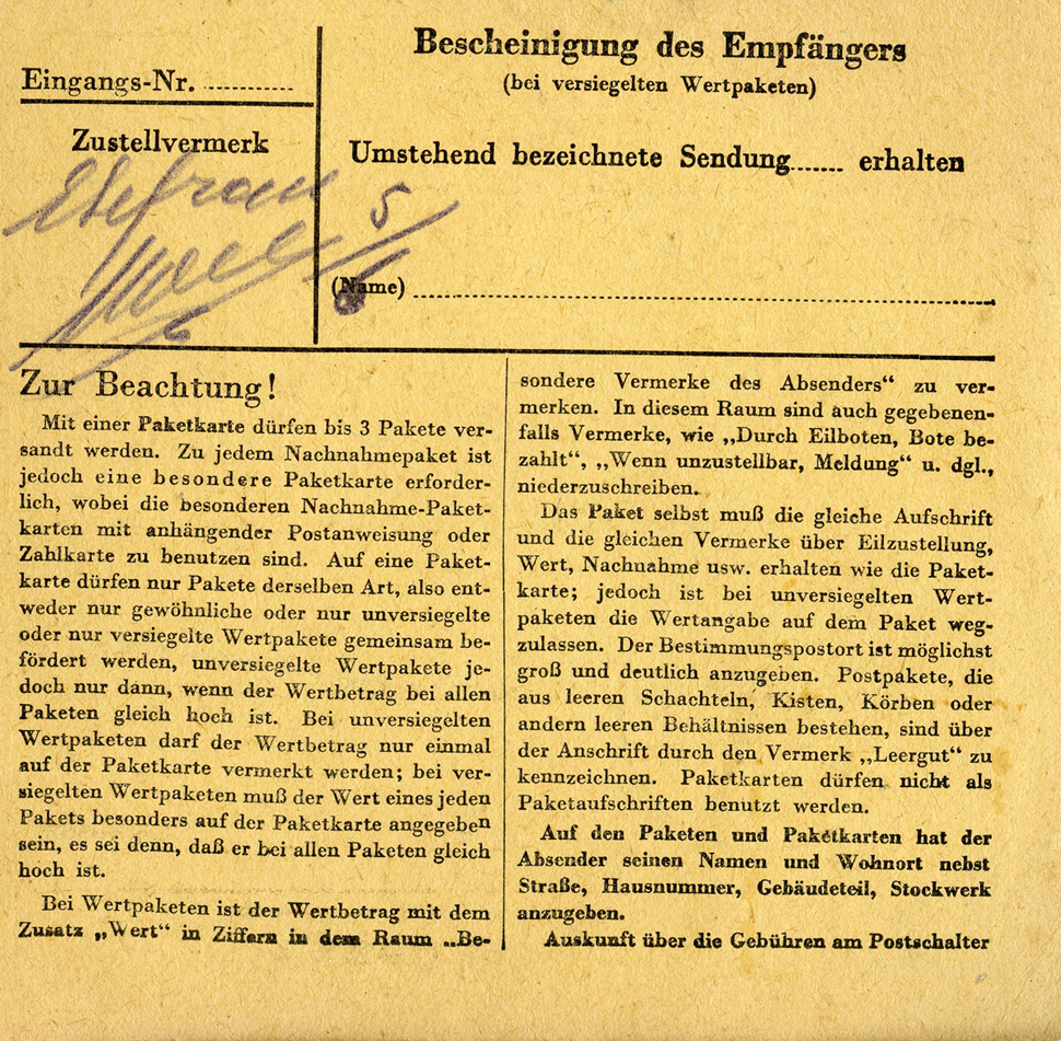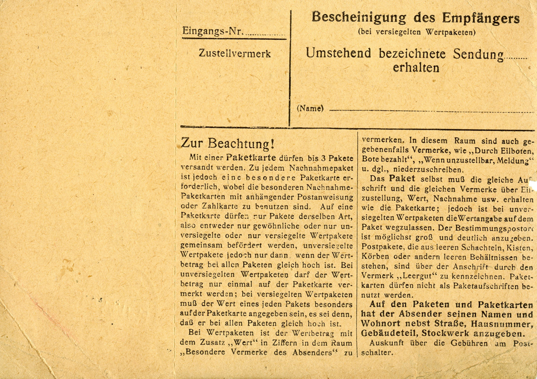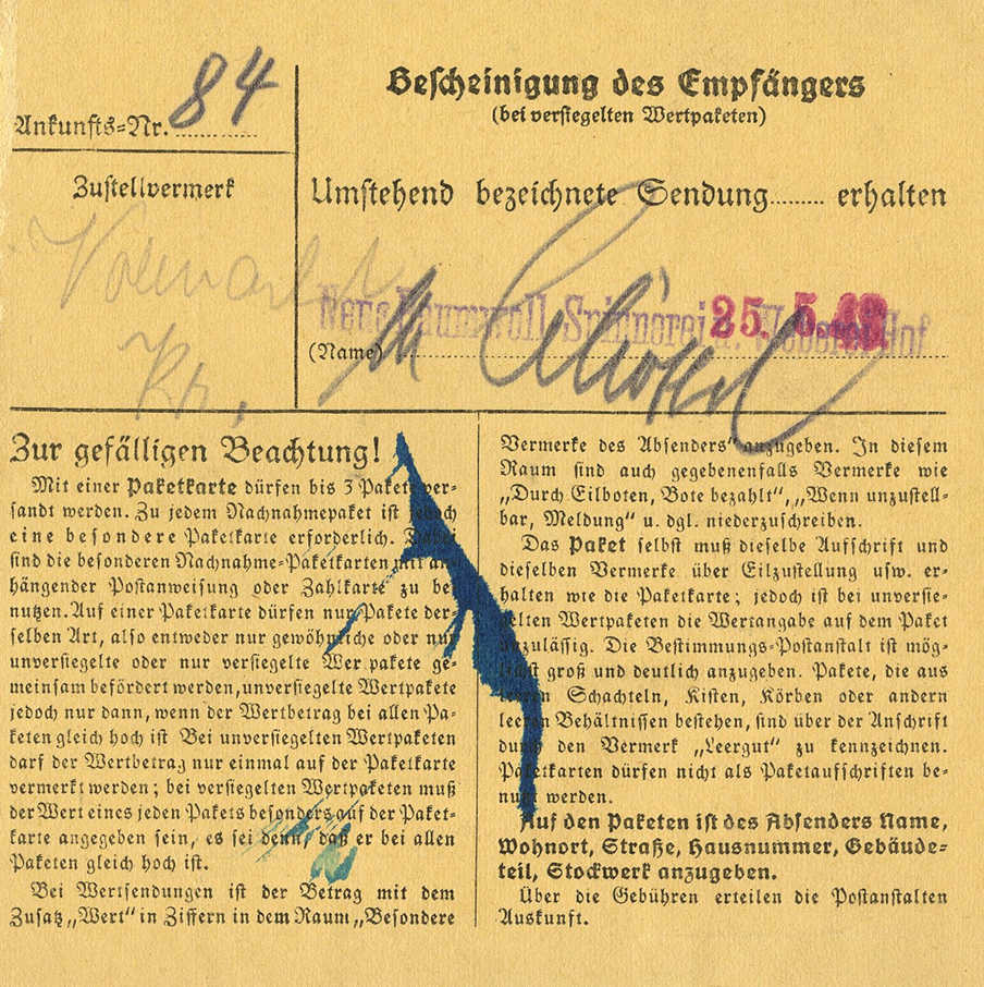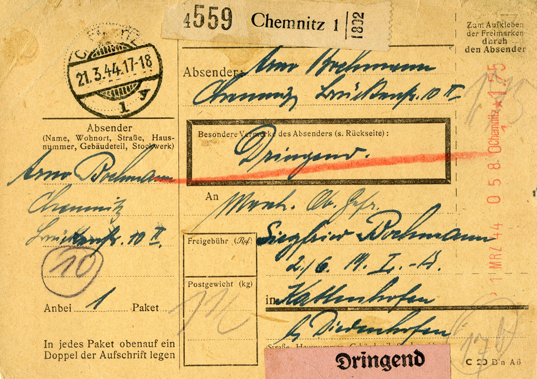 [Below: This is a parcel receipt, from Chemnitz, March 21, 1944.]