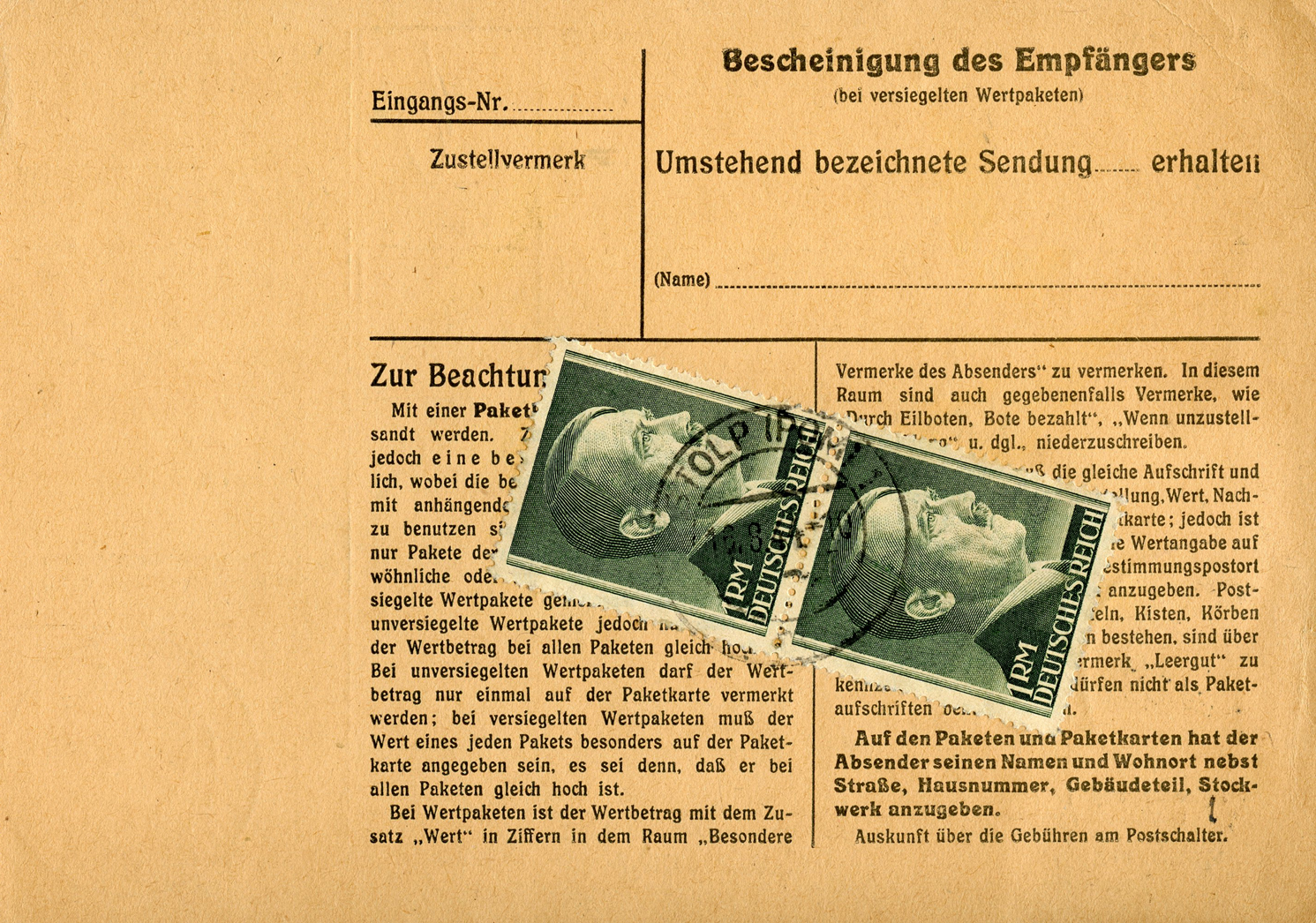 [Below: Here is a parcel receipt from Stolp, Pomerania, August 16, 1944.]
