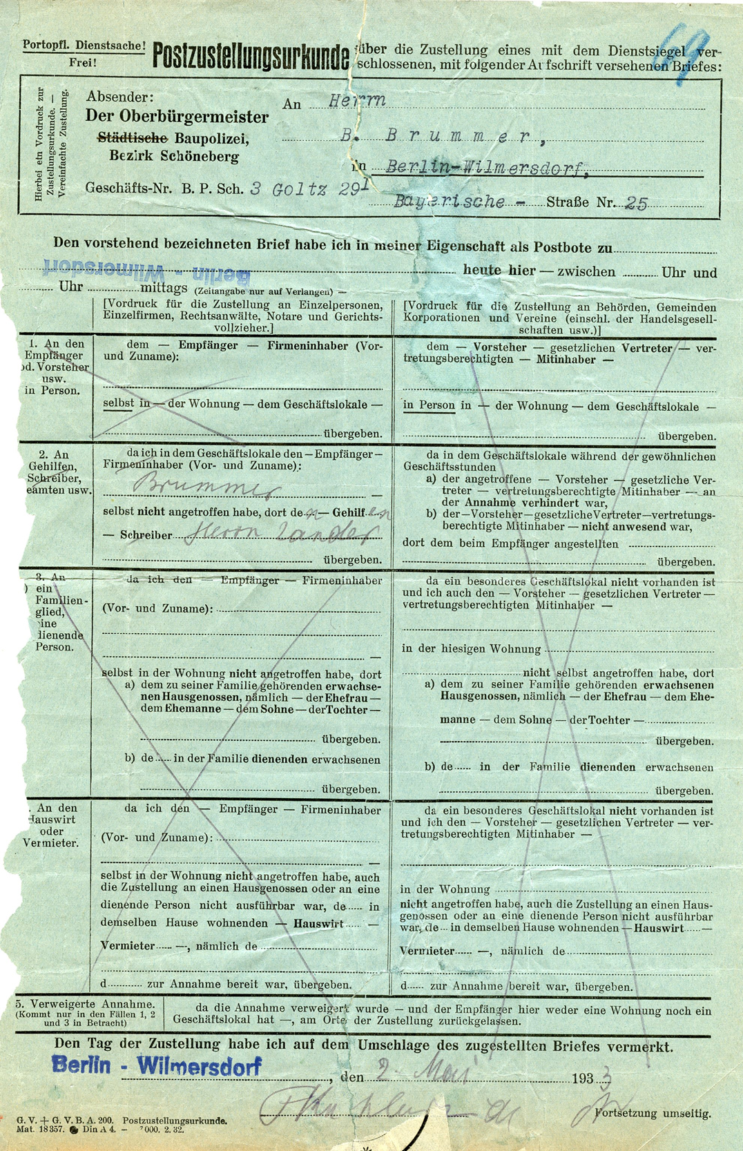 [Below: This is a proof of delivery official letter from the Mayor of Schöneberg, with official tape that was used to officially seal the letter.]