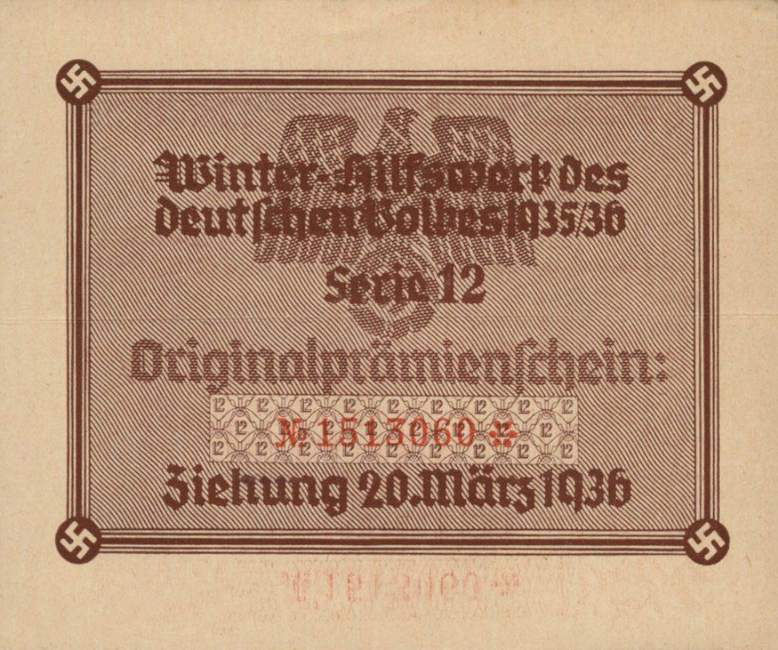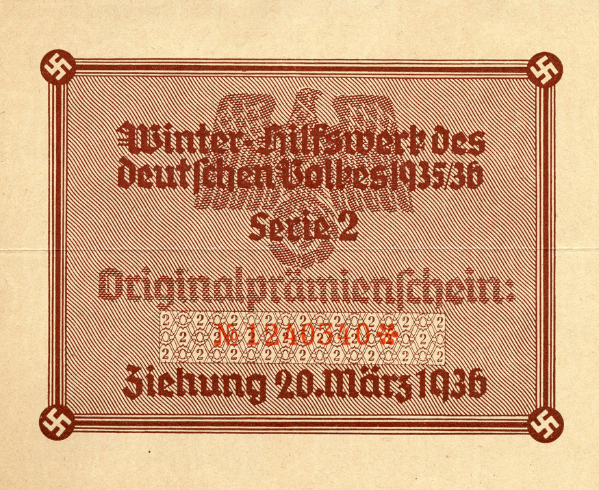 [Below: Winterhilfswerk lottery ticket from March 20, 1936, series 2. Click to enlarge.]