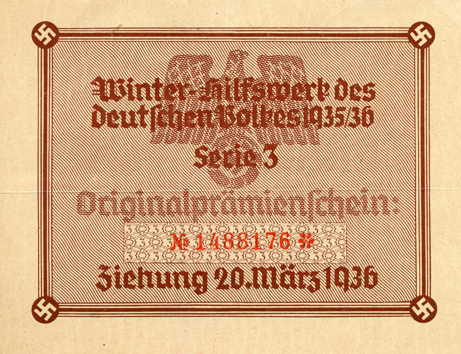[Below: Winterhilfswerk lottery ticket from March 20, 1936, series 3. Click to enlarge.]
