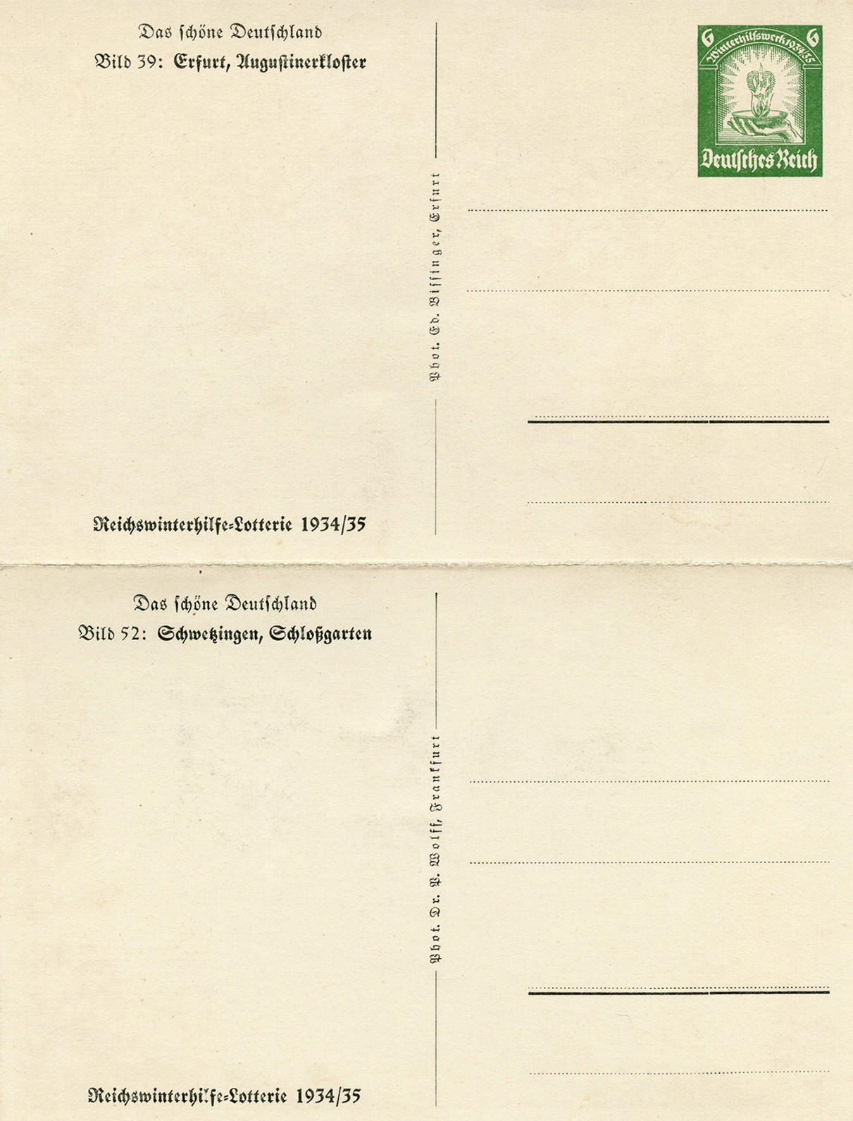 [Below: Double postcard from the 1934-35 Reichwinterhilfe=Lotterie (Reich Winter Aid Lottery). Click to enlarge.]