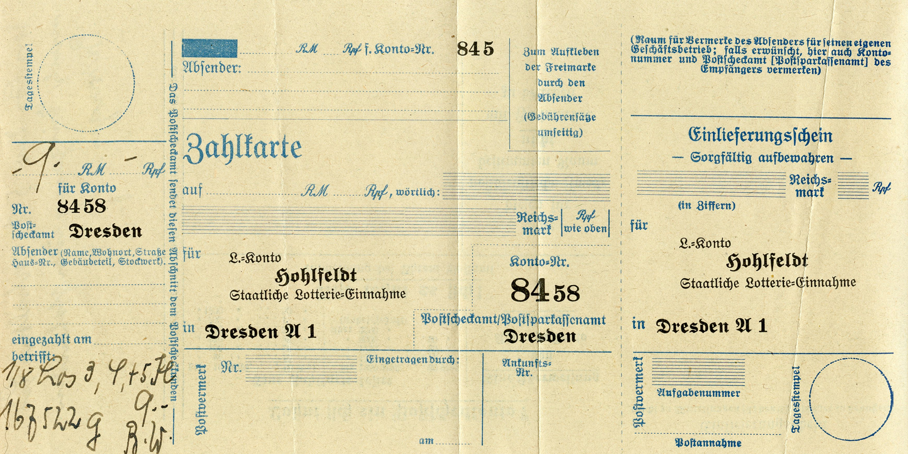 [Below: This was with the papers above. Postcard/form to send to the State Lottery Office, from Dresden. Click to enlarge.]