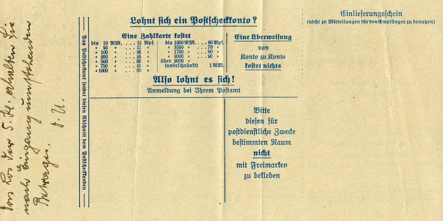 [Below: Reverse of document. 'Reichsversicherungsanstalt für Angestellte überversichert. Soweit Urkundensteuer für diesen in einer Ausferrtigung vollzogenen Vertrag zu entrichten ist, ist sie je zur...' (Reich Insurance Institution for Salaried Employees overinsured. Insofar as documentary tax is payable for this contract executed in one copy, it is to be paid at the rate of...)]