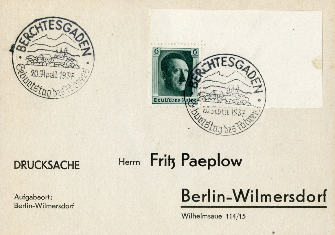 [Below: Postcard using a partial sheet, from architect and master builder Fritz Paeplow, postmarked on April 20, 1937.]