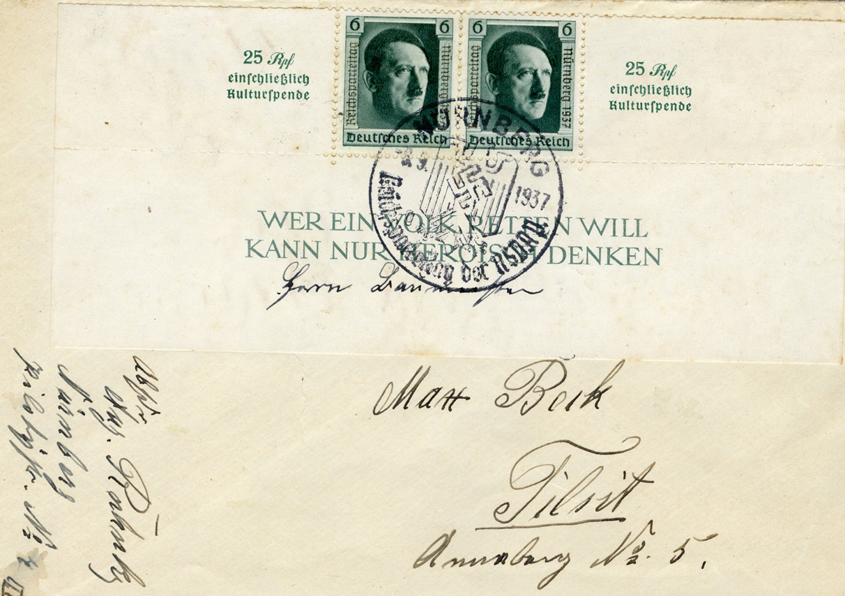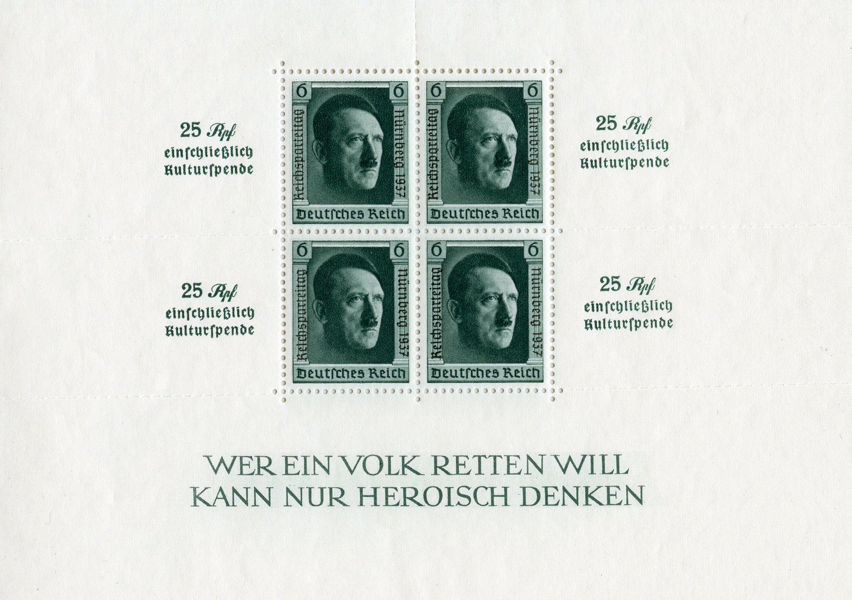 einschließlich Kulturspende' (25 Rpf including cultural donation). This was issued in celebration of the 9th Reich Party Day.]
