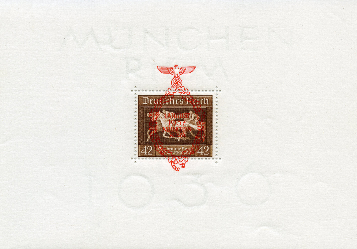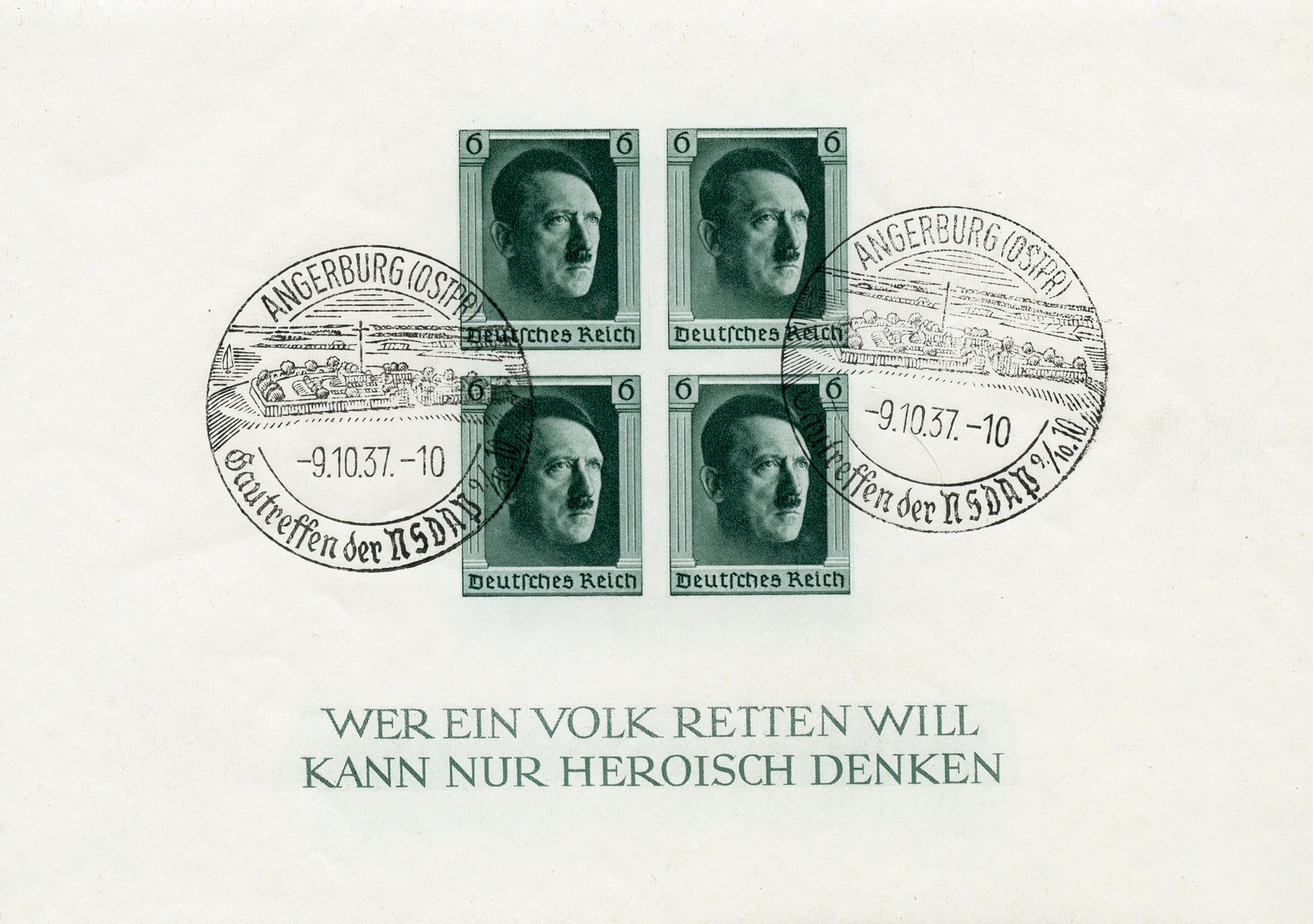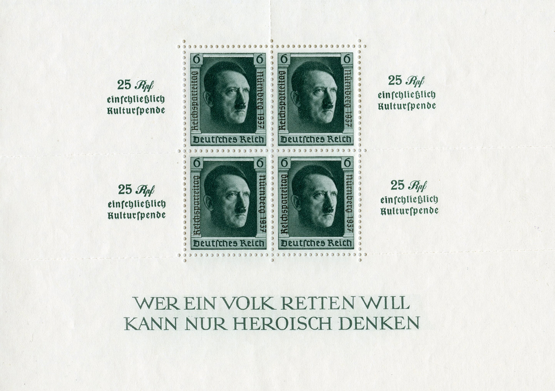 [Below: Here is an unused souvenir sheet with perforations and 1937 Reichsparteitag overprint.]