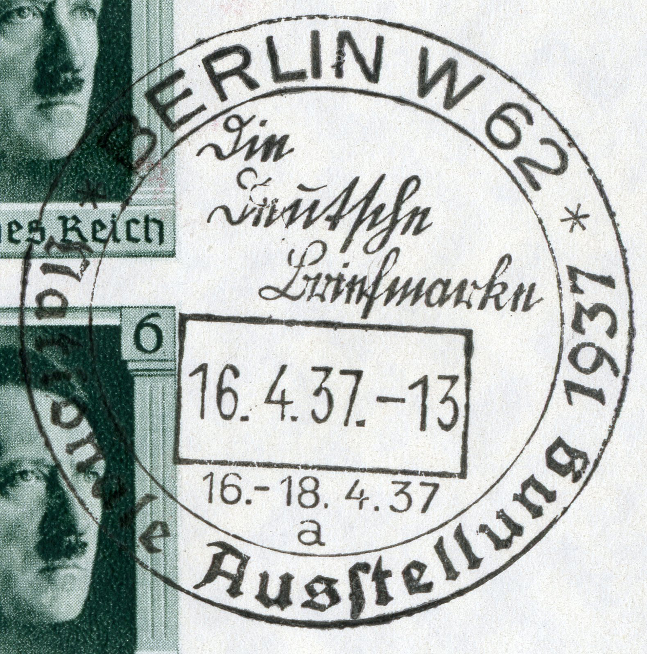 [Below: This envelope was postmarked in Berlin on April 17, 1937 and sent to Brussels, Belgium. Nationale Ausstellung means 'National exhibition' stamp show.]