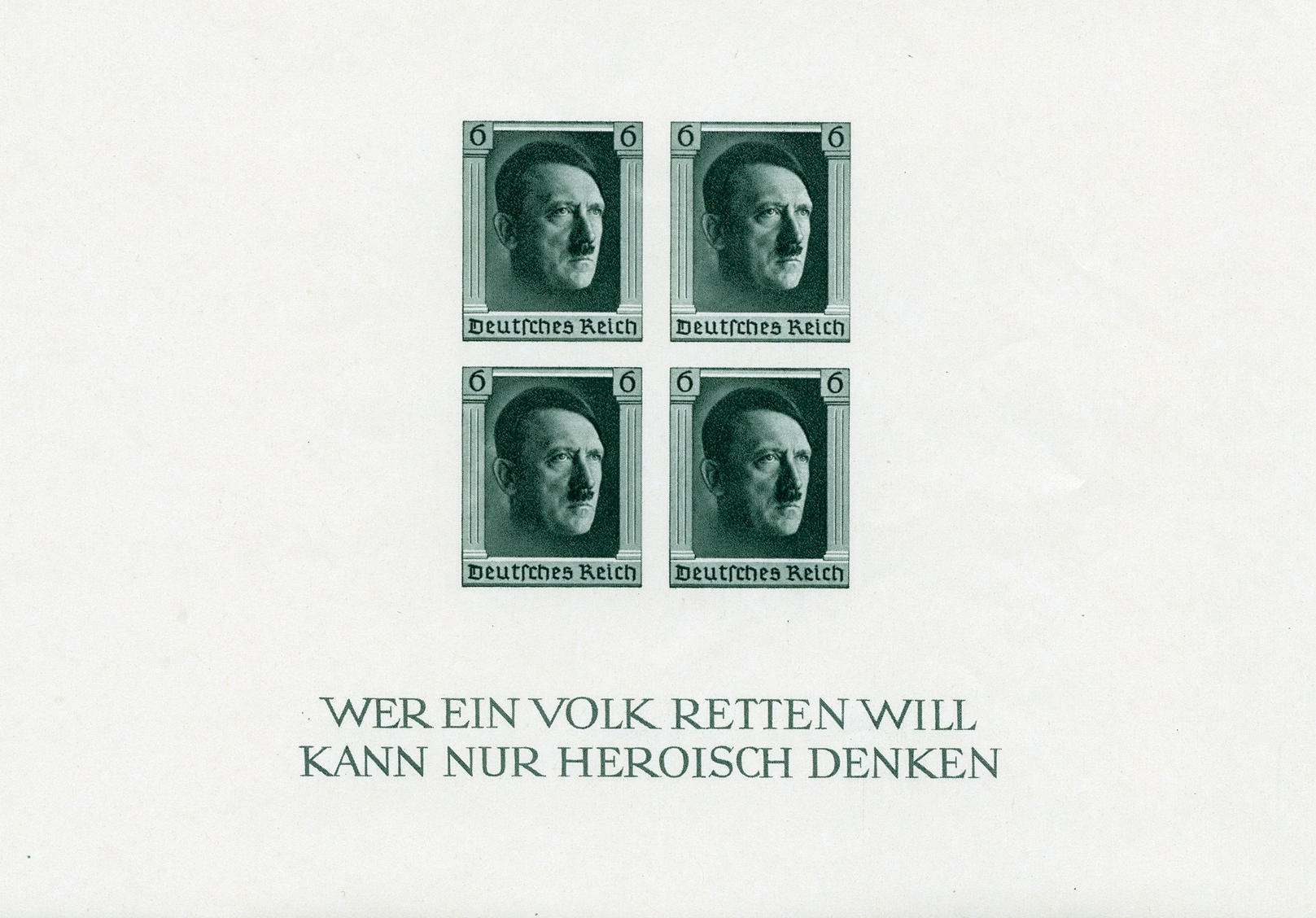 [Below: Souvenir sheet of the type inside the top wrapper above. This was released on April 5, 1937 and was done by the artist Prof. R. Klein. This issue celebrated the 48th birthday of Adolf Hitler.
