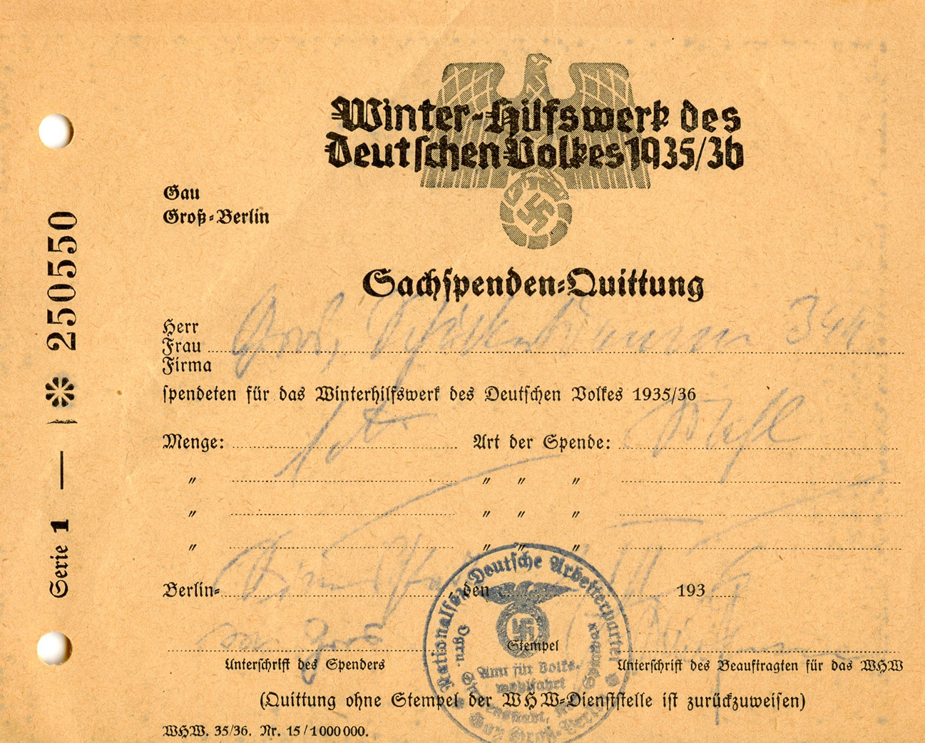 [Above: 1936 WHW donation slip.]