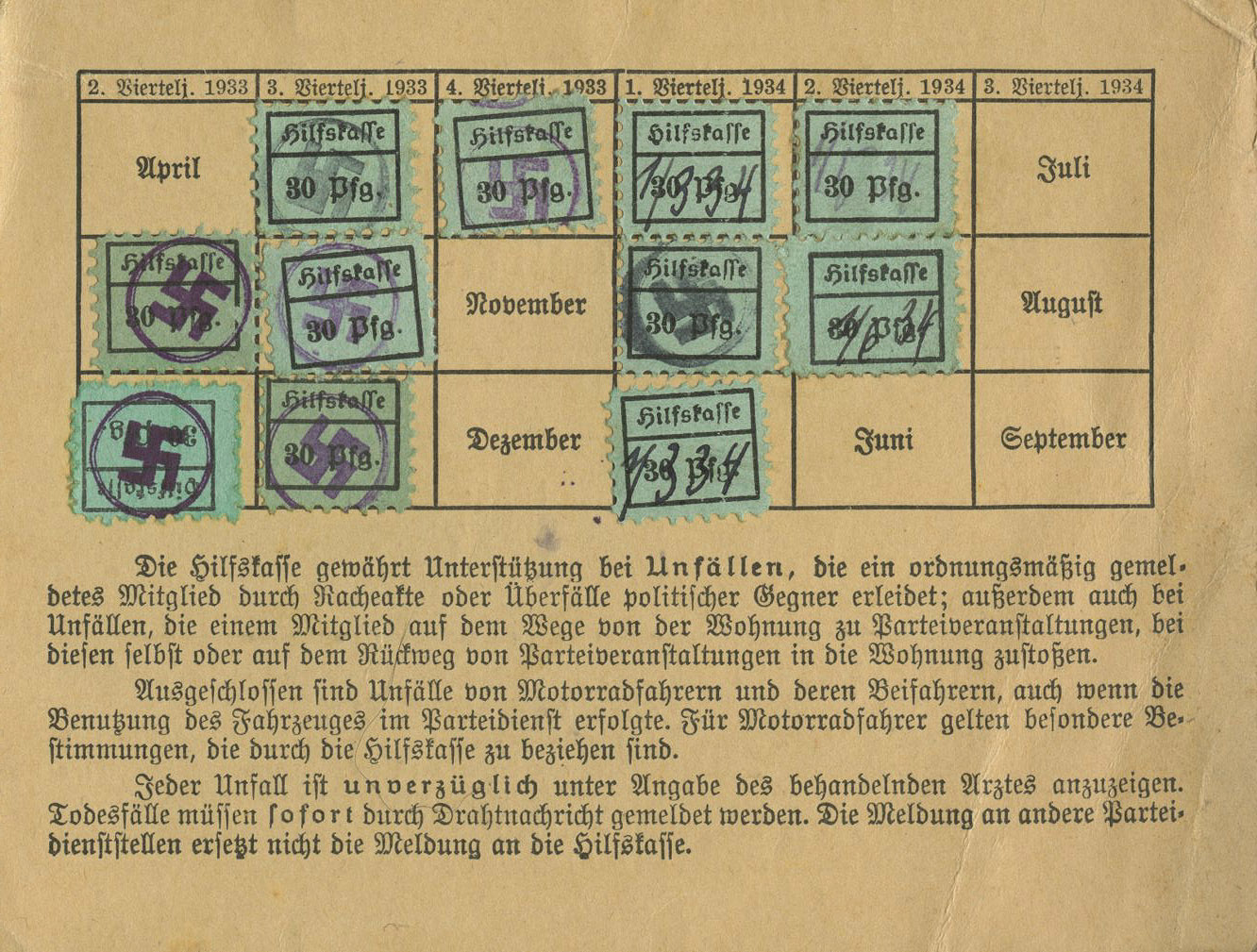 [Below: This card says: 'Hilfs-kasse der Nationalsozialist Deutschen Arbeitpartei Quittungskarte' (Relief Fund of the National Socialist German Workers' Party Receipt Card).]