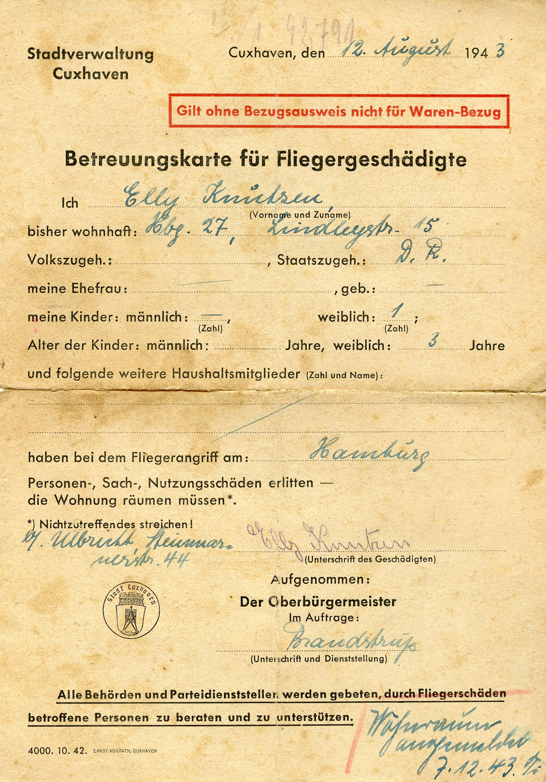 This lists basic information; the woman filling out the card was named Elly (the card is from August 12, 1943), she had a 3 years old female child and the air raid which destroyed her house was in Hamburg. Hamburg was a place of mass murder by fire. The Allies purposely used bomb that burned the whole city down, killing an untold 100,000s civilians.]