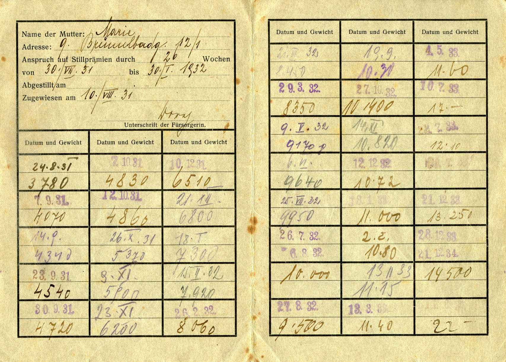 'Datum and Gewicht' (Date and weight). So this is just a weight chart. It starts at August 24, 1931 to December 21, 1934. Strange that insurance wanted this information.]